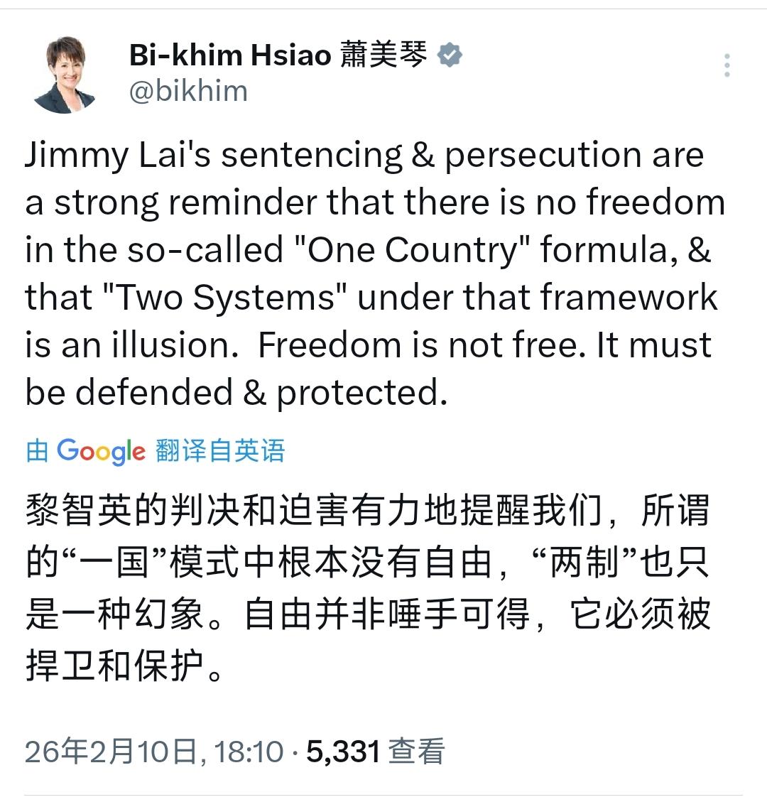 台湾地区副领导人萧美琴昨晚(2月10日晚)发文叫嚣道:“黎智英的判决和迫害有力地提醒我们,所谓的‘一国’模式中根本没有自由,‘两制’也只是一种幻象。自由并非唾手可得,它必须被捍卫和保护。” [机智]评几句:萧美琴的言论完全是颠倒黑白、贼喊捉贼的拙劣表演,其本质就是借乱港分子黎智英一案恶意抹黑“一国两制”、疯狂操弄意识形态对立。黎智英触犯法律、危害国家安全,受到法律制裁完全是法治社会的应有之义,与所谓“自由”毫无关系。萧美琴身为“台独”顽固分子,无视国家主权与法治底线,刻意混淆是非、煽动对立,本质上是为“台独”分裂行径寻找借口,妄图把台湾推向危险深渊。她口中的“自由”,不过是分裂国家、出卖民族利益的遮羞布,既背叛民族大义,也违背两岸同胞共同意志,只会遭到全体中华儿女的坚决反对和历史的彻底唾弃,任何“台独”言论与行径,最终都必将以彻底失败告终。