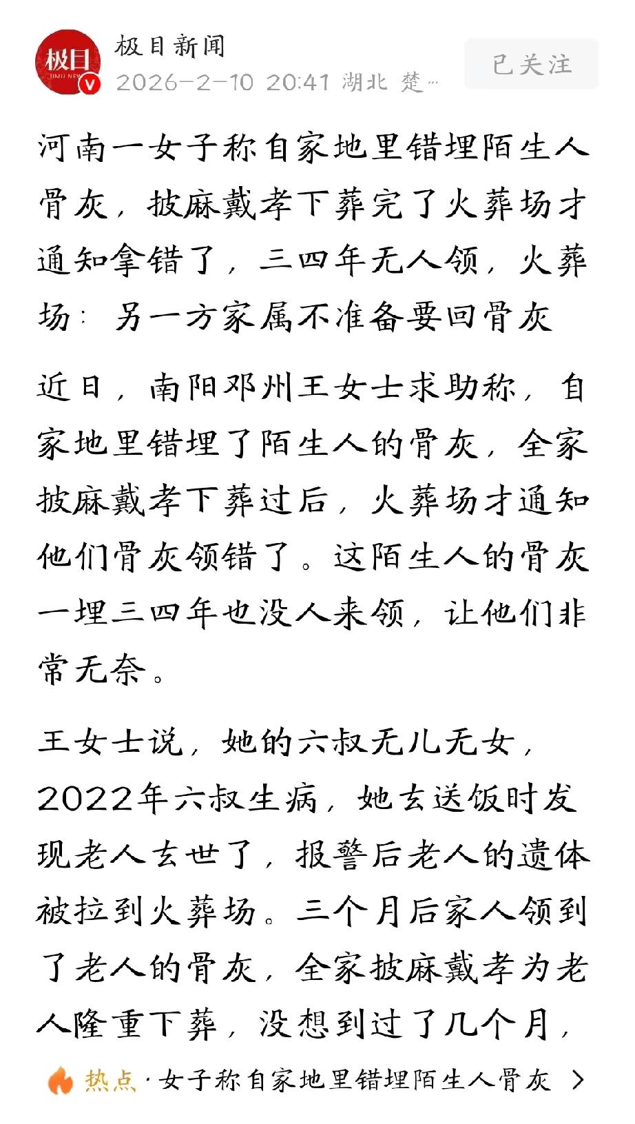 河南南阳,女子一家人披麻戴孝把老人的骨灰下葬,几个月后,火葬场突然通知她,当时把骨灰给错了,女子只能把老人骨灰领回重新下葬,可之前错埋的骨灰却迟迟没人来领,这一埋就是三四年,女子不敢动,也不知道该怎么办,心里实在膈应的慌。火葬场表示,当时弄错骨灰的工作人员已经去世,对方家属也不准备要回骨灰。明明是火葬场的失误造成的问题,如今却是一副不想管的态度。 2022年,南阳邓州的王女士遭遇了一件让她全家糟心又无奈的事。 王女士的六叔无儿无女,一直由她照料生活。某天她像往常一样去给六叔送饭时,突然发现老人已经离世,面对人生无常,王女士有些慌乱,赶紧报警求助。 在警方的安排下,六叔的遗体被送到了当地火葬场,一家人强忍着悲痛,等待着后续火化和领取骨灰的事宜。 可谁知,火化的过程并不顺利,王女士并没有当场拿到六叔的骨灰,一直过了三个月,王女士才终于等到火葬场的通知,前去领取了六叔的骨灰。 拿到骨灰盒的那一刻,一家人悲痛万分,按照当地的习俗,全家披麻戴孝,为六叔举办了隆重的葬礼,将骨灰妥善下葬在了自家地里。 本以为这样就能让老人能入土为安,王女士和家人心里也算是有了一丝慰藉。 可谁也没想到,安稳日子没过几个月,王女士突然又接到了火葬场的电话,这个电话如同晴天霹雳,让一家人瞬间懵了。 火葬场告知他们,之前领走并下葬的骨灰根本不是她六叔的,是他们给错了! 王女士想不通,火化这么大的事,竟然能给错骨灰?好好的葬礼,竟然埋错了人,这让她和家人们既愧疚又不知所措。 原来,是另一位逝者的家属去火葬场领骨灰时,发现自家亲人的骨灰已经被王女士一家领走下葬了,而王女士六叔的骨灰还一直留在火葬场没被领走,火葬场这才发现了骨灰错领的问题,联系了王女士。 得知真相后,王女士第一时间赶到火葬场,领回了自己六叔的骨灰,重新披麻戴孝,再次妥善下葬,让真正的亲人得以安息。 自家的亲人入土为安了,但她家的地里还埋着一个陌生人的骨灰,这情况令谁都膈应的慌,王女士也想早点把这个陌生骨灰请走。 当时火葬场的工作人员承诺,等这件事的误会解决后,就会尽快派人把王女士家地里错埋的陌生人骨灰取走,可这一等,就是三四年。 这几年里,王女士一家出于对逝者的尊重,不敢随意挪动,生怕做出不礼貌的事,可骨灰一直埋在自家地里,始终是块心病,一家人每天都觉得心里别扭,却又无计可施。 这几年里,王女士多次找火葬场沟通,希望对方能履行承诺,把错埋的骨灰取走,可火葬场的回应却让她寒心。 火葬场表示,当年弄错骨灰的工作人员已经去世了,还称当初王女士的亲戚和这名工作人员相熟,没有按照正规流程领取骨灰,才导致了骨灰错领的问题。 更气人的是,火葬场表示,另一方逝者的家属明确表示,不准备要回这份骨灰了。 话里话外,火葬场都摆出了不想负责、不愿处理的态度,这让王女士一家既气愤又无奈。 无奈之下,王女士只能向媒体求助,希望能有人帮忙解决这个难题。 好在经过多方沟通协调,火葬场终于意识到了他们的责任,不再推诿,同意派人将王女士家地里的陌生人骨灰起走,妥善存放到骨灰堂中,同时也表示今后会严格规范骨灰领取流程,避免再出现类似的失误。 如今,埋在王女士家地里三四年的陌生骨灰已经被顺利起走,困扰王女士一家多年的烦心事终于得到了解决。 其实,王女士完全可以主张精神损害赔偿,而不是这样的忍气吞声。 《最高人民法院关于确定民事侵权精神损害赔偿责任若干问题的解释》第一条规定:因人身权益或者具有人身意义的特定物受到侵害,自然人或者其近亲属向人民法院提起诉讼请求精神损害赔偿的,人民法院应当依法予以受理。 骨灰属于具有人格象征意义的特定纪念物品,承载近亲属的情感寄托与丧葬伦理。 火葬场错发骨灰,导致王女士一家先错葬他人骨灰、后重新安葬亲人,精神上遭受惊吓、愧疚与长期困扰。 陌生人骨灰滞留自家田地三四年,更造成持续心理不适与人格尊严受损,符合“精神损害”法定情形。 王女士可向法院主张精神损害抚慰金,火葬场作为专业机构,因重大管理过失侵害逝者家属人格利益,即便无主观故意,仍需承担侵权赔偿责任。 火葬场以其“工作人员已去世”的理由,并不能成为减免精神损害赔偿的合法抗辩。