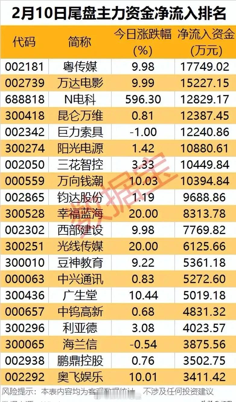 净流入排名中,传媒影视、AI、新能源、通信等板块个股表现突出,粤传媒、万达电影等资金流入居前,部分个股如N电科、幸福蓝海、光线传媒涨幅较大,资金对影视传媒、AI应用等方向偏好明显,同时也有部分个股逆势获资金青睐。个股梳理1. 粤传媒:主营广告营销、报刊发行及新媒体,2025年三季报归母净利润1.23亿元,同比增12.34%;尾盘主力资金净流入17749.02万元,涨幅9.98%,资金博弈春节档传媒行情。2. 万达电影:主营影院投资运营、影视制作发行,2025年预计归母净利润12-15亿元,同比扭亏;尾盘主力资金净流入15227.15万元,涨幅9.99%,受益春节档票房预期。3. N电科:主营电子元器件及系统集成,2025年三季报归母净利润3.45亿元,同比增28.76%;尾盘主力资金净流入12829.17万元,上市首日涨幅596.30%,资金追捧军工电子概念。4. 昆仑万维:主营AI大模型、游戏及社交平台,2025年三季报归母净利润18.67亿元,同比增156.23%;尾盘主力资金净流入12387.45万元,涨幅0.81%,AI业务持续推进。5. 巨力索具:主营索具及相关产品,2025年三季报归母净利润0.32亿元,同比降18.56%;尾盘主力资金净流入12240.86万元,跌幅1.00%,资金逆势布局。6. 阳光电源:主营光伏逆变器、储能系统,2025年三季报归母净利润42.56亿元,同比增35.21%,尾盘主力资金净流入10880.61万元,涨幅1.42%,储能业务增长稳健。7. 三花智控:主营热管理系统及零部件,2025年三季报归母净利润25.68亿元,同比增42.33%;尾盘主力资金净流入10449.84万元,涨幅3.33%,受益新能源汽车及AI温控需求。8. 万向钱潮:主营汽车零部件及底盘系统,2025年三季报归母净利润6.89亿元,同比增12.15%;尾盘主力资金净流入10394.84万元,涨幅10.03%,汽车智能化业务推进。9. 钧达股份:主营光伏电池及组件,2025年三季报归母净利润15.23亿元,同比增89.67%;尾盘主力资金净流入9688.86万元,涨幅1.19%,TOPCon电池产能释放。10. 幸福蓝海:主营影视制作、影院运营,2025年预计归母净利润0.8-1.2亿元,同比扭亏;尾盘主力资金净流入8313.78万元,涨幅20.00%,涨停创历史新高。11. 西部建设:主营商品混凝土及建材,2025年三季报归母净利润5.67亿元,同比增21.34%;尾盘主力资金净流入7769.82万元,受益基建投资复苏。12. 光线传媒:主营影视制作发行、动漫IP运营,2025年预计归母净利润3.5-4.5亿元,同比增50%以上;尾盘主力资金净流入6125.66万元,春节档影片催化。13. 豆神教育:主营教育信息化、AI教育产品,2025年三季报归母净利润-0.56亿元,亏损收窄;尾盘主力资金净流入5361.18万元,AI教育业务拓展。14. 中兴通讯:主营通信设备及解决方案,2025年三季报归母净利润85.23亿元,同比增18.76%;尾盘主力资金净流入5272.60万元,5G及算力业务推进。15. 广生堂:主营肝病药物及创新药研发,2025年三季报归母净利润0.12亿元,同比增235.67%;尾盘主力资金净流入5019.18万元,创新药管线推进。16. 中钨高新:主营钨制品及硬质合金,2025年三季报归母净利润4.23亿元,同比增15.68%;尾盘主力资金净流入4831.32万元,钨价上涨支撑业绩。17. 利亚德:主营LED显示及夜游经济,2025年三季报归母净利润6.78亿元,同比增32.45%;尾盘主力资金净流入4023.57万元,Micro LED业务拓展。18. 海兰信:主营海洋电子信息及智能装备,2025年三季报归母净利润0.23亿元,同比降45.67%;尾盘主力资金净流入3875.56万元,资金布局海洋经济概念。19. 鹏鼎控股:主营PCB及柔性电路板,2025年三季报归母净利润18.56亿元,同比增25.34%;尾盘主力资金净流入3502.75万元,AI服务器PCB需求增长。20. 奥飞娱乐:主营动漫IP及玩具业务,2025年三季报归母净利润0.45亿元,同比增123.45%;尾盘主力资金净流入3411.42万元,AI+动漫IP布局。总结2月10日尾盘主力资金净流入个股覆盖传媒影视、AI、新能源、通信等多个赛道,影视传媒板块因春节档预期获资金集中流入,AI、新能源等科技赛道也有资金布局,部分个股逆势获资金青睐,市场对业绩增长及题材催化的标的偏好明显。