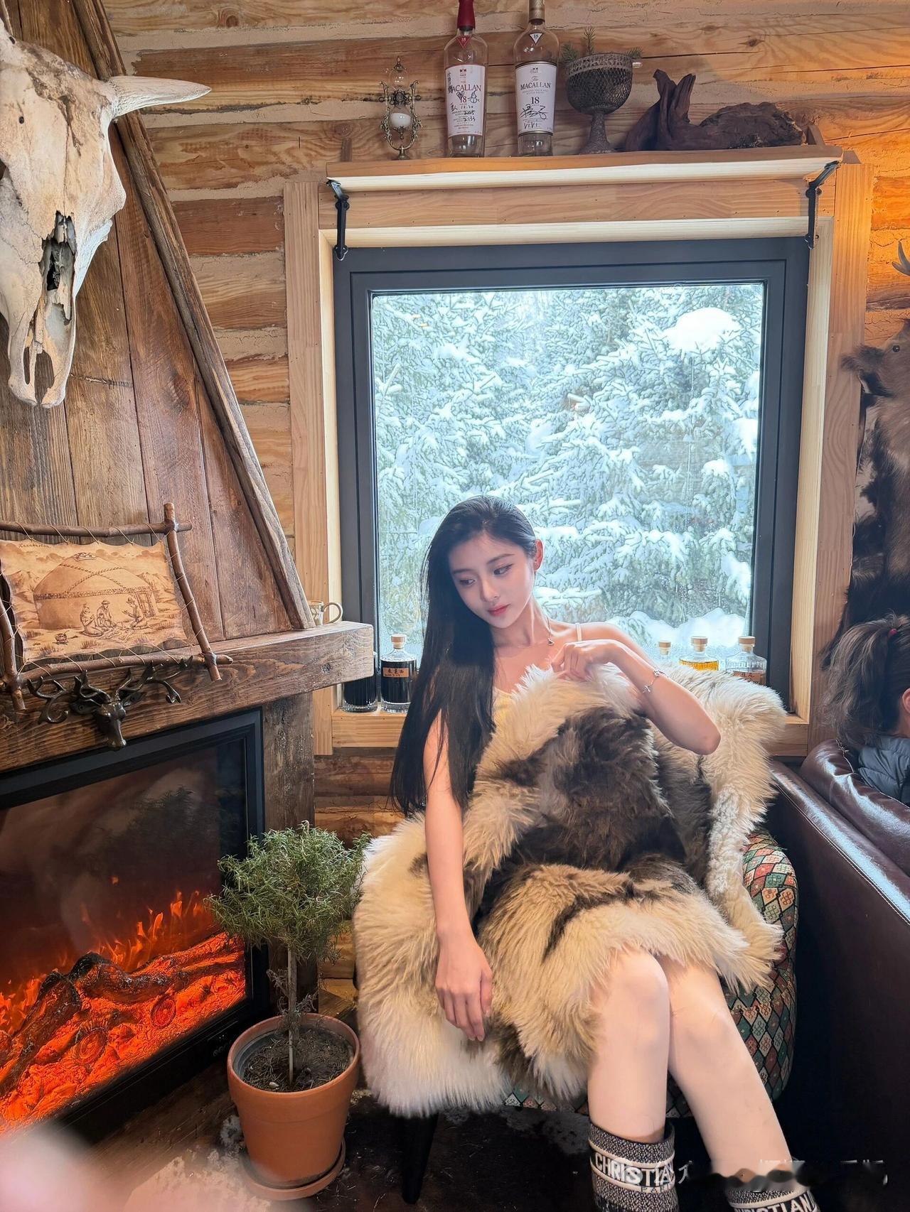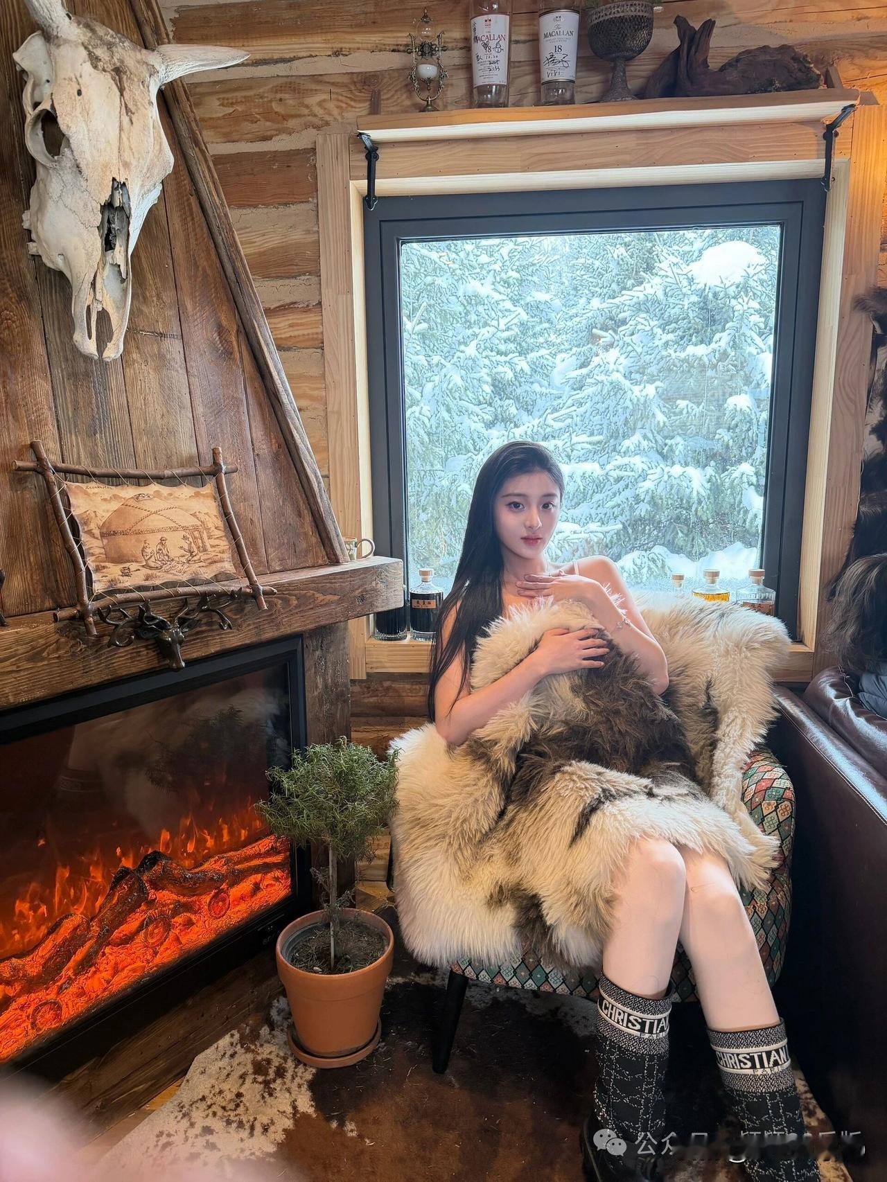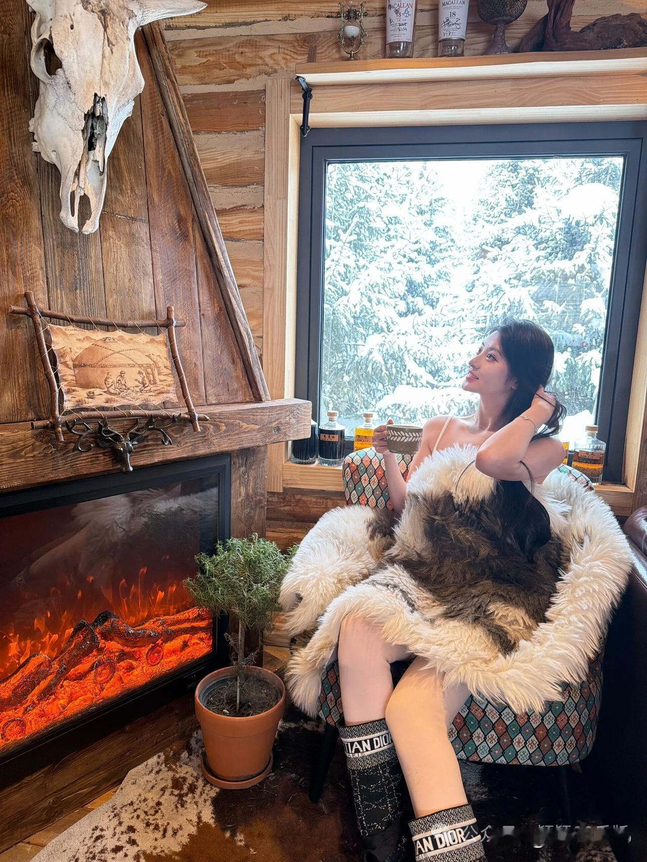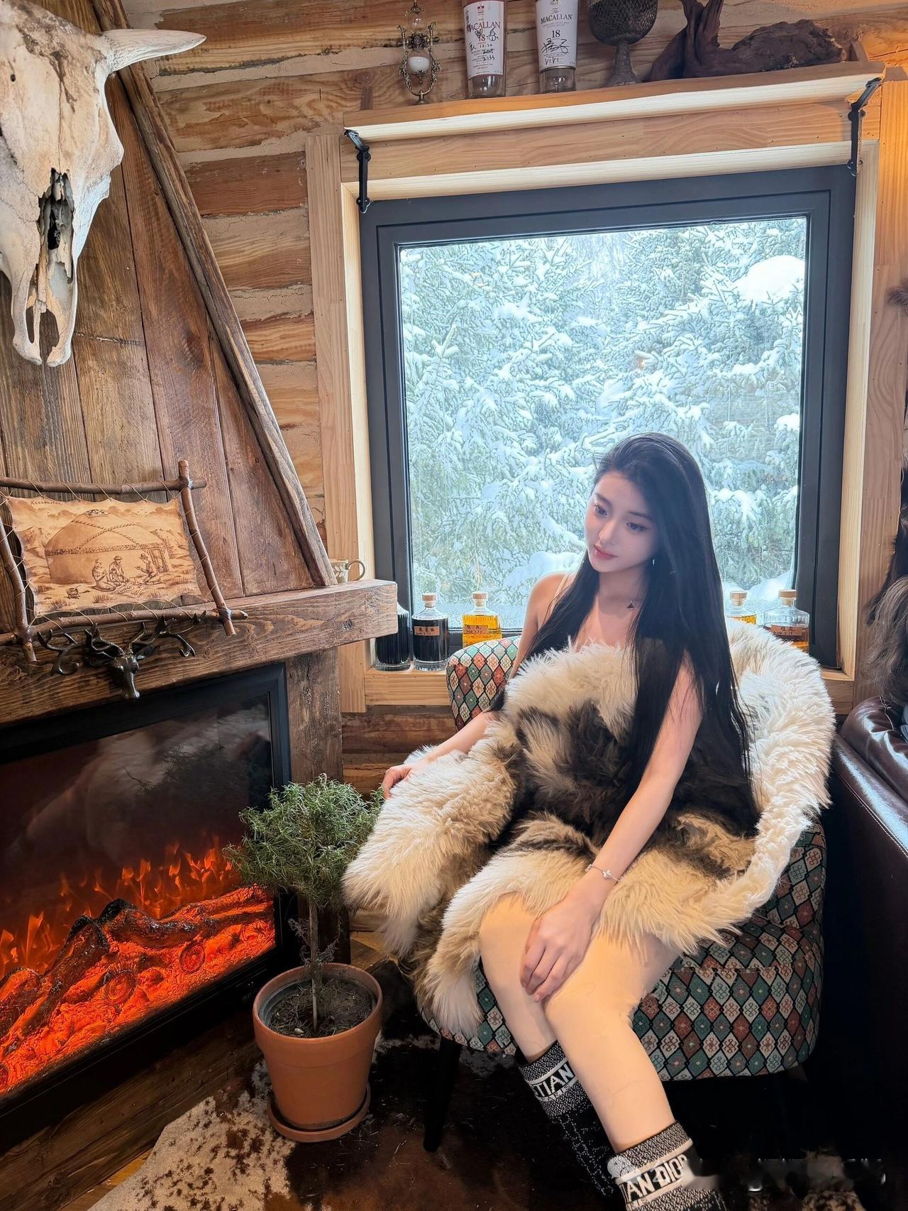 炉火暖心房,雪景映窗纱。
