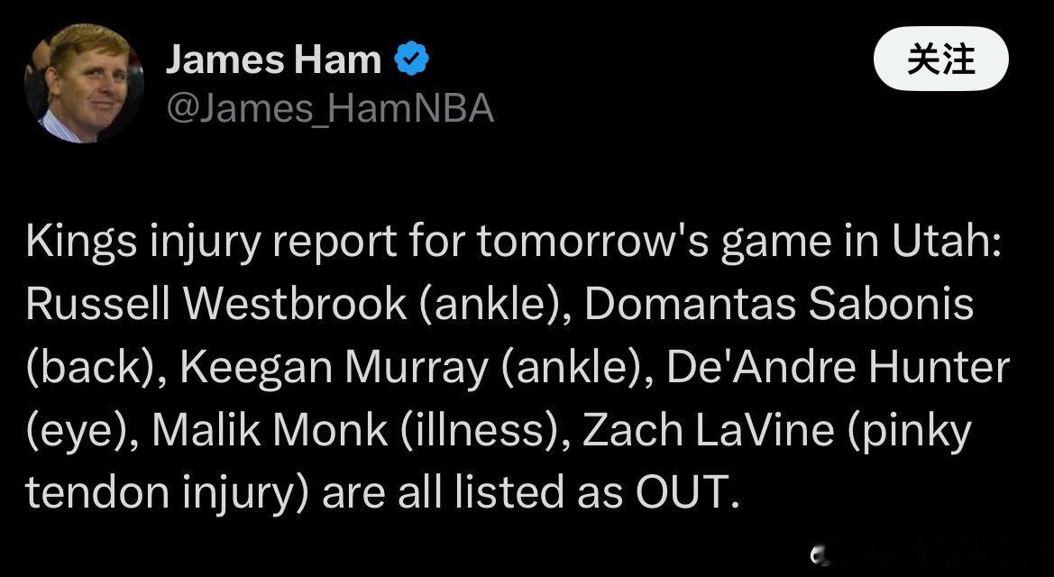 继续连败?国王明日客场对阵爵士,威少、小萨博尼斯、基根-穆雷、亨特、蒙克、拉文均缺席❌