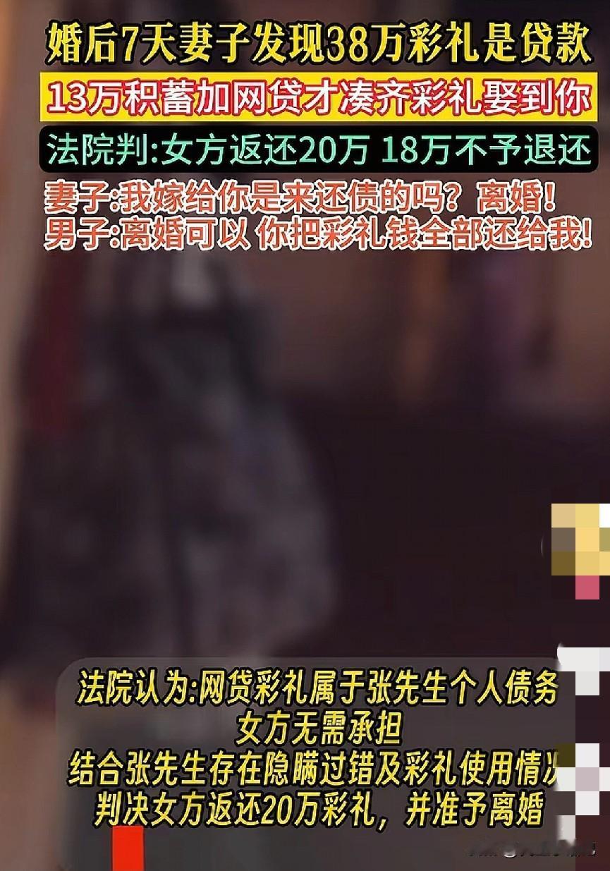你能接受彩礼竟然是贷款吗?婚后竟然要求女方“一起还”,这样的婚你还敢结吗? 这不就有一家人,彩礼给的倒是很大方,38万元在当今彩礼中,可不算小数目。可没想到婚后才第三天,竟然装也不装了,直接告诉女方,这是贷款给的钱,婚后夫妻得一起承担。 女方一听,气不打一处来,直接怒吼对方一家是欺骗行为,最后法院判决离婚,认定男方存在贷款骗婚的行为,彩礼只退还了20万。 这不就是空手套白狼吗?合着女方嫁过来,一分好处没捞着,先背一身债?合着男方家一分钱没花,白捡个老婆,还得跟着你一起吃苦还债?这哪是结婚啊,这分明是合伙还债,还是你单方面设好的局。 婚姻最基本的是什么?是坦诚,是真心,不是算计。一开始就满是心眼,一开始就藏着债务,一开始就想着怎么把压力转嫁给另一半,那以后日子能好过吗? 柴米油盐还没开始,先为彩礼贷吵得鸡飞狗跳,本来甜甜蜜蜜的婚姻,刚进门就背上包袱,换谁谁受得了? 真心娶你的人,不会让你刚结婚就背债,在乎你的人,不会拿贷款彩礼来套路你。没钱不可怕,可怕的是又没钱、又没诚意、还满脑子算计。这种婚,别说敢结了,躲都来不及。真心换真心,套路换伤心,就这么简单。大家觉得呢? (图片来自网络视频)
