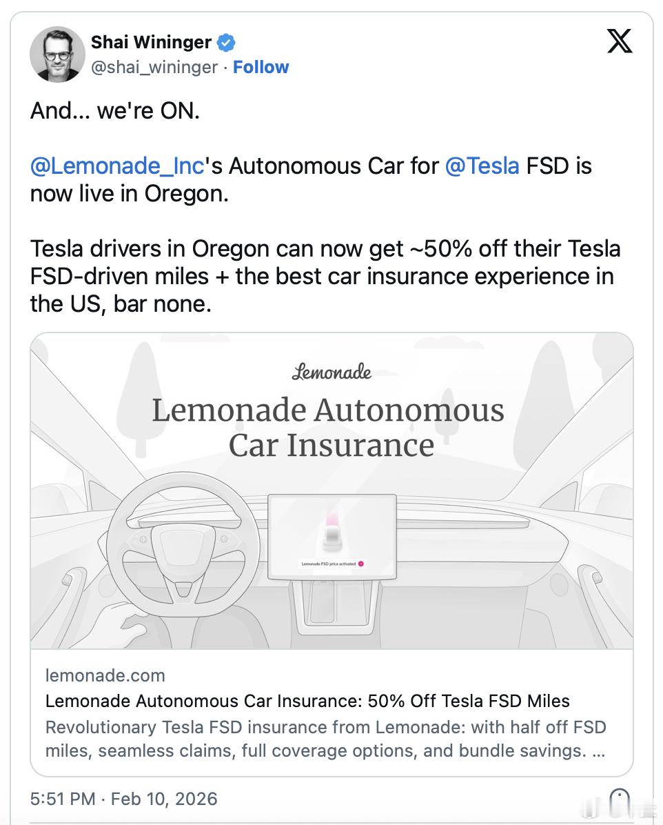 Lemonade创始人在推特上宣布,在俄勒冈州上线了特斯拉FSD保险,符合条件的特斯拉车主使用FSD时每英里都能获得约50%保费折扣。