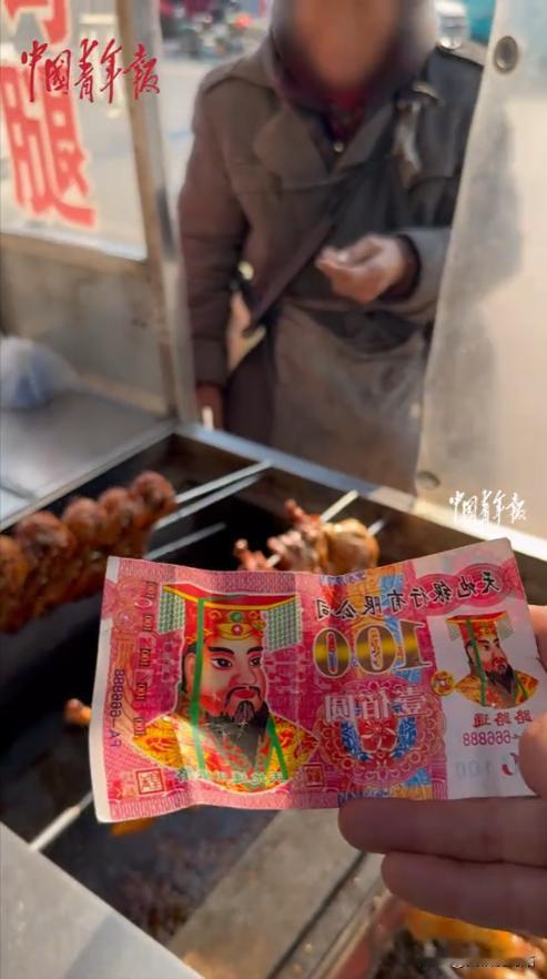山东枣庄,一个老奶奶,拿着一张冥币,来到一个烤串摊前,她把冥币递给老板,要了一个烤串,让人惊讶的是,老板居然开心地收下了冥币,还把烤串给了老奶奶,有人吓得赶紧跟老板说:“赶紧把这钱丢掉,大过年的,不吉利!”老板却说:“我不惧阴阳,不怕这些!” 枣庄冬天的夜里冷得硬,风一吹,手背很快就发紧,小吃街却是另一种温度:烤炉里炭火红着,油滴落下去“滋”一声,白烟带着肉香往上飘,人声一多,连冷都像被挤散了。 刘先生的摊子就在这样的地方,小炉子、铁架子、调料盒、一次性手套,摆得很顺手,他在这儿干了很多年,熟客一眼就能认出他:围裙上总沾着油点,手脚麻利,烤串翻面的动作,像是不用想就能做出来。 对他来说,这一晚也本该是普通的一晚——忙到深夜,收摊回家,第二天继续。 直到一个老人慢慢挪到摊前,老人穿得干净,头发梳得整齐,但眼神有点飘,像是在找东西,又像不知道自己该往哪儿去。 她站了好一会儿,才伸手从口袋里掏出一张纸递过来,旁边的人看清楚了,立刻有点发怵:那不是人民币,是冥币,上面印着“天地银行”。 在很多人的观念里,这东西只该出现在祭祀场合,出现在热热闹闹的小吃摊前,会让人本能地觉得不舒服,有人小声说“别收,扔了吧”,还有人更直接,提醒刘先生“大过年的别沾这个”。 刘先生的反应却很平常,他没有皱眉,也没把手缩回去,更没有摆出嫌弃的表情,他就像平时收钱一样,顺手接过来,往围裙兜里一塞,动作快得让人来不及再说第二句。 然后他转身挑了几串肉多的,烤得更仔细,刷酱、撒料、翻面,最后还用手在空中扇了两下,让热气稍微散一点,才递到老人手里。 老人接过去,低头就吃,吃得很认真,那种认真像是“我付了钱,我就可以安心吃”,脸上反而有一点踏实。 旁边的人,这时才慢慢看明白:这并不是今天才发生的“奇怪交易”,更像是摊主长期以来的一个习惯。 老人不是来捣乱的,她可能根本不知道自己递出去的是什么,只知道一条最朴素的规矩——吃东西要付钱。 她手里能拿出来的“钱”,有时是玩具币,有时是广告卡片,有时就是这种冥币,她的记忆已经乱了,可能认不清钱长什么样,但“不能白拿别人东西”这件事还没丢。 刘先生说起过,最开始他也想直接送她吃,毕竟看她这样,谁都不忍心,可老人不愿意,你一说“不要钱”,她就把手收回去,不吃,甚至会急,像被人当成了讨饭的。 她的固执不是为了占便宜,反而是一种对自尊的坚持:我不是来求施舍的,我是来买东西的。 后来刘先生就换了方法,他不再跟老人争“要不要钱”,而是配合她把那套“买卖流程”走完:你递给我东西,我当作钱收下;我给你烤串,你就能心安理得地吃。 对外人而言这像“被骗了”,对老人而言却是被尊重。她需要的是这个。 时间久了,这条街上的一些摊主也都知道了,有人会默默多给她一点:铁板烧多加个蛋,炸物挑小一点、软一点的,怕她咬不动;汤多盛一点,天冷了喝下去暖和。 大家不太会当面说“我在帮你”,就当成正常生意里的小照顾,因为一旦把话说破,老人那点仅剩的体面,可能又撑不住了。 这次冥币引发争议,更多是因为春节前大家更忌讳,可刘先生说得很直白:她没坏心,就是想吃点东西。 你要他当场把冥币扔了、把老人轰走,他做不到,他也很清楚,如果自己拒收,老人很可能转身就走,可能一路走一路找,最后饿着回去,甚至迷路都不一定。 有人劝他“别沾这个”,他回了一句类似“我不怕”的话,听起来硬,其实是一种很朴素的价值排序:虚的忌讳和眼前人的饥饿,哪个更重要?他选了后者。 所谓“身正不怕”,不是什么豪言壮语,就是他觉得自己做的是对的,不需要躲躲闪闪。 后来这段视频传到网上,大家的关注点也慢慢变了,起初很多人只盯着“冥币”两个字,觉得离谱、膈应。 但看清整件事之后,更多人开始讨论的是:一个认知障碍的老人,为什么会独自出来买吃的?家里人在哪里?社区有没有照护?以及,一个小摊主为什么能做到这种程度的耐心? 有人写了一句评价,被转了很多次,大意是“老人递的是天地银行,摊主讲的是天地良心”。 话可能有点文艺,但意思很实在:那张纸在现实里不值钱,可摊主愿意用自己的方式让老人保住体面,让她吃上一口热的。 夜里炉火还在响,街上还在吵,老人吃完慢慢走开,那张冥币在围裙兜里皱着,最后可能会被他随手扔掉,也可能攒着一把再处理。 但对这晚的老人来说,那张纸已经完成了它的作用:她付过钱,她没有欠人情,她可以挺直腰板吃完这顿热乎的,对很多人来说,这才是整件事最“贵”的地方。