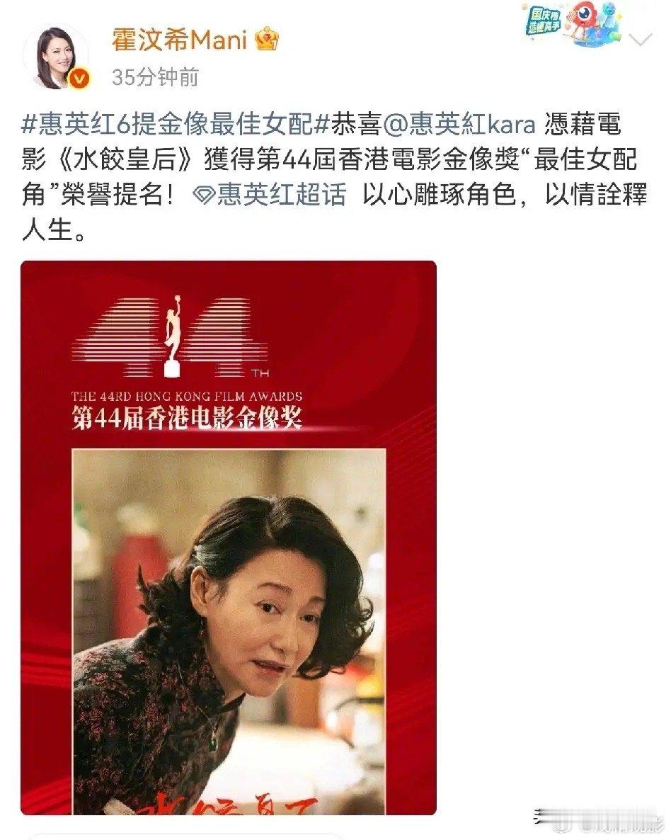 2月10日下午,霍汶希突然在社交平台高调发文,字里行间都是满满的激动和敬佩,原来此次她是恭喜惠英红入围了金像奖最佳女配角提名。从文字里看出,霍汶希很懂得惠英红的不易。要知道,惠英红这份荣耀背后,是她从底层挣扎到影坛传奇的半生坎坷,每一步都走得格外艰难。她3岁便在湾仔码头乞讨、卖口香糖,整整十年靠街头求生;入行当武打女星,不用替身满身伤痕,脸上缝过89针,22岁拿下首届金像影后,却因武打片没落无戏可拍。事业低谷、抑郁症缠身,她曾绝望到自杀未遂,在黑暗里挣扎多年。后来她放下身段从头再来,从配角演起,把生活的苦难揉进角色里,哭戏共情力拉满,市井小人物演得入木三分。如今65岁仍活跃荧幕,六度提名金像女配,手握多座奖杯,用实力改写命运。从街头乞讨到奖项常客,惠英红的人生比剧本更传奇。这次提名,是对她演技的认可,更是对她逆风翻盘人生的最好致敬。