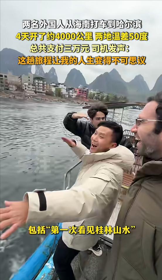 “这就是有钱任性!”近日,海南,两名外国男子,为了体验中国的风土人情,竟在软件约了个出租车司机,想要从海南开到哈尔滨,这把司机吓得不轻,不过还是同意了,就这样,三人边开边玩,最终在4天后,到达了哈尔滨!司机:我的人生变得不可思议! 发起这趟旅程的是两名深爱中国的外国友人,其中一位是来自以色列的高佑思,毕业于北京大学国际关系学院,还是“歪果仁研究协会”的创始人,在网上拥有不少关注度。 另一位是来自法国的萧闱鸿,两人都是“中国通”,却不满足于常规景点打卡,总想用更特别的方式,感受中国南北的极致差异。 思来想去,他们放弃飞机、高铁,选择打车从海口出发一路向北到哈尔滨,用四天时间穿越大半个中国,体验不同地域的风土人情与气候变迁。 可他们在打车软件上发布这份特殊订单时,却接连遭遇拒绝。 毕竟路程远、风险高、开销大,没有司机愿意轻易接下这份“冒险订单”,直到39岁的海南本地出租车司机罗师傅刷到了它。 罗师傅在海南开了多年出租车,初中没毕业就出来谋生,这辈子从没离开过海南岛,最远也就去过三亚,日复一日的跑车生活平淡如水,他从没想过,一份打车订单会让自己的人生翻天覆地。 刚看到订单时,罗师傅的手都忍不住发抖,反复确认好几遍,才敢相信真有人要打车从海南开到哈尔滨。 在冒险的冲动与对未知的好奇下,罗师傅最终鼓起勇气,接下了这份改变自己一生的订单。 三人初次见面时毫无陌生感,高佑思和萧闱鸿用不太熟练的拼音和罗师傅沟通,还主动送上进口巧克力,举止得体又真诚。 为打消罗师傅的顾虑,两人提前预付1.5万元车费,明确表示路上所有开销都由他们承担,这份诚意彻底拉近了三个陌生人的距离。 1月19号一早,三人准时从海口出发,一场跨越四千公里的温暖旅程正式开启。 车子驶出海口,罗师傅第一次坐上琼州海峡的轮渡,看着窗外后退的海岸线,他满心激动,这是他39年来第一次真正“出岛”。 一路向北,风景不断变换,从海南的椰风海韵到广西的青山绿水,再到北方的寒风白雪,每一段路程都藏着惊喜。 途经桂林时,罗师傅第一次见到传说中的山水美景,激动地给家里打电话分享,眼底满是欢喜。 路途中出租车突发故障,罗师傅一下慌了神,担心这趟旅程取消,留下诸多遗憾。 但高佑思和萧闱鸿十分镇定,立刻联系4S店维修,得知无法快速修好后,果断就近租了新车,所有费用全额承担,丝毫没有耽误行程。 这一路三人相处融洽,边开边玩。 途经湖南,罗师傅第一次眺望长江,内心满是震撼; 途经北京,他第一次来到天安门广场,对着国旗肃立致敬,眼眶泛红; 途经沈阳,气温骤降,两人提前准备的厚衣服也派上了用场。 每到一处,罗师傅都会给家人打视频报平安,分享自己的“第一次”惊喜。 高佑思和萧闱鸿也细心照顾罗师傅,主动适配他的节奏,三个毫无交集的人,渐渐变成了无话不谈的朋友。 历经四天长途跋涉,1月23号,三人终于抵达哈尔滨。 刚下车,零下二十度的刺骨寒风与漫天白雪,让一辈子生活在热带的罗师傅彻底看呆了。 这是他人生中第一次见真雪真冰,戴着两人准备的毛绒雷锋帽,他笑得像个孩子,还忍不住舔了一口路边的冰,满脸难以置信。 随后两人带他去了冰雪大世界,巨大的绿色冰塔、晶莹的冰雕让他目不暇接,最后只说出四个字:太漂亮了。 1月24号分别之际,三个相处四天的朋友紧紧相拥,罗师傅忍不住落泪,满心不舍,萧闱鸿脸上既有完成行程的轻松,也藏着一丝眷恋。 罗师傅坐在车里,望着两人的背影感慨,自己的人生变得不可思议,这趟旅程让他实现了39年来的无数个第一次。 行程结束后,罗师傅从哈尔滨坐飞机到桂林,再开车返回海口。 2月9号晚上,他开启直播分享这段特别的旅程,言语间满是欢喜,一个劲夸赞东北好玩,直言下次还要去。 这趟旅程意义非凡,他不仅攒足半年房租,还掌握了使用地图的技能。出租车副驾储物箱里,那两个歪歪扭扭的中文福字,是他与同伴留下的,成了温暖至深的纪念。 这件事传开后,网友议论纷纷,有人调侃两人“有钱任性”,也有人质疑四天四千公里属于疲劳驾驶,十分危险。 但抛开争议,这趟旅程最动人的,从来不是“有钱任性”的冒险,而是三个陌生人之间纯粹的信任与情谊。 外国友人敢将自己的安全托付给素不相识的中国出租车司机,罗师傅敢放下生计,跟随两名陌生人横跨大半个中国,这份毫无套路、彼此尊重的情谊难能可贵。 这更像是一场心与心的相遇,一场不同文化的交融,高佑思和萧闱鸿用特别的方式读懂了中国的温暖,罗师傅也跳出小世界,收获了全新的人生体验。