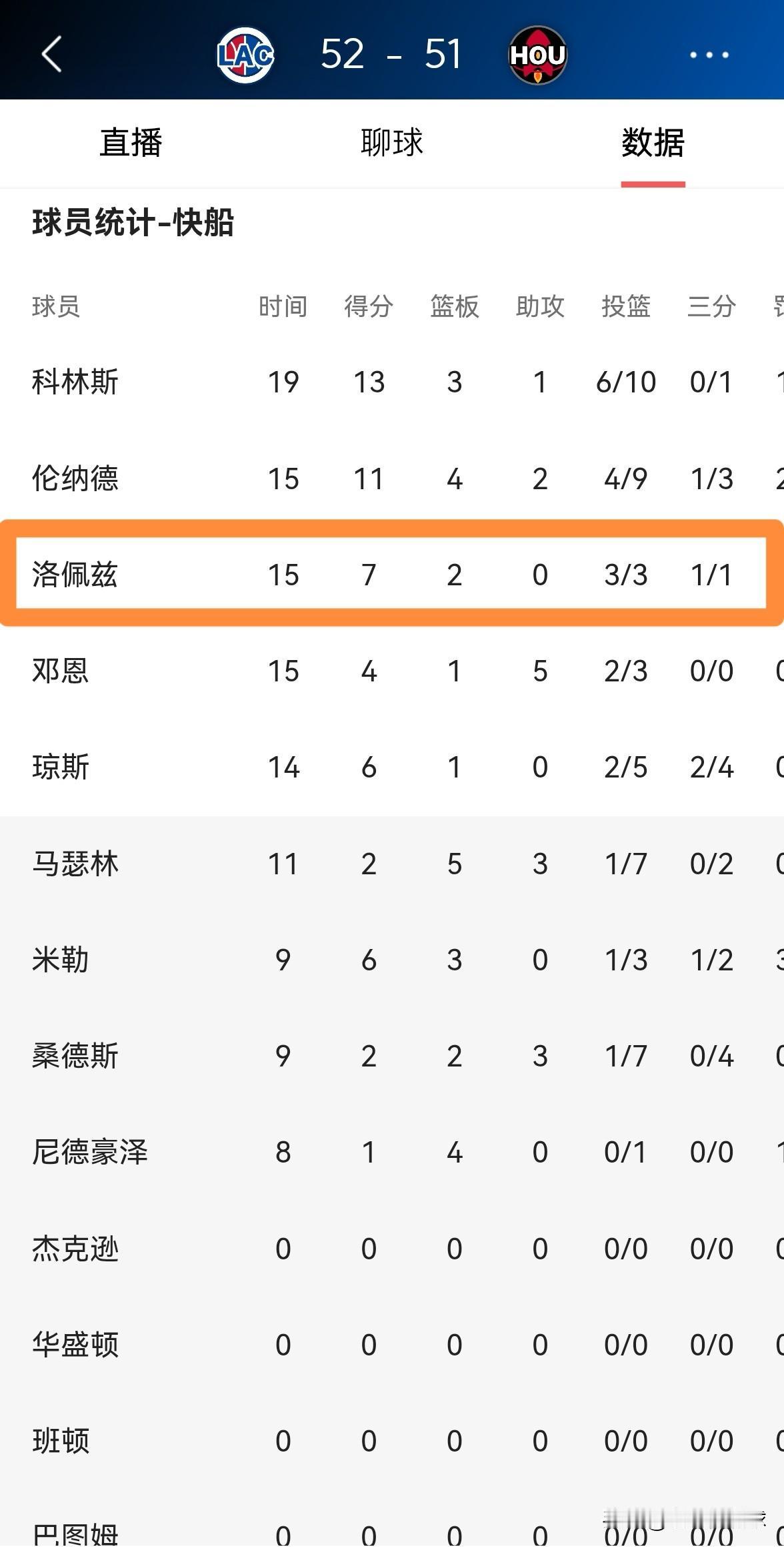 快船老将洛佩兹真是太让人喜出望外了!在今天快船客场挑战火箭的比赛中,目前双方的上半场比赛已经结束,快船以52:51领先对手1分。在前两节比赛中,老将洛佩兹首发出战15分钟,投篮3中3,其中三分球1中1非常高效的砍下7分,还有2篮板1抢断,没有出现任何的失误。 作为一名37岁的老将,洛佩兹能够在前两节比赛中打出如此出色的表现,真是让人感到惊喜。