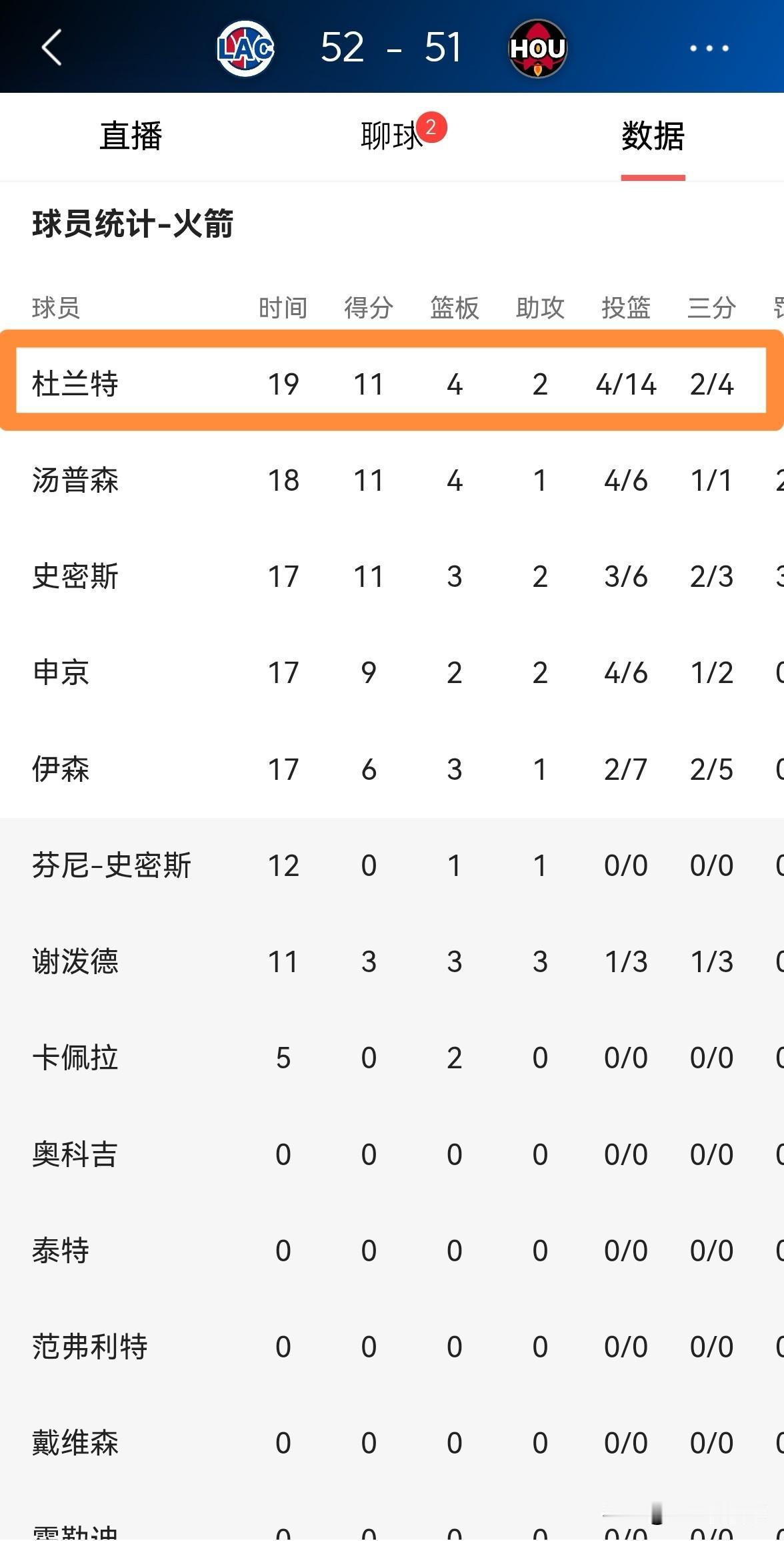 火箭巨星杜兰特的进攻效率真是低的可怜!在今天火箭主场迎战快船的强强对话中,目前双方半场战罢,火箭以51:52落后于对手。在前两节比赛中,杜兰特的进攻效率非常的低,他在首发出战的19分钟里,投篮14中4,其中三分球4中2、罚球1中1非常低效的得到11分,还出现了3次失误。 毫不夸张的说,如果杜兰特在下半场比赛中继续拉胯的话,我认为火箭必败无疑。
