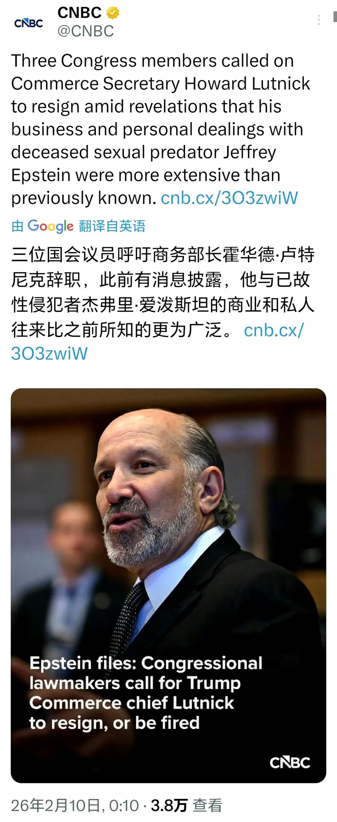 美国司法部公布300万页爱泼斯坦档案之后,事件每天都在发酵,现在对美国政坛构成了越来越大的冲击。 由于美国司法部说现在可以查阅没有涂黑的爱泼斯坦档案,所以民主党众议员罗希特·康纳与共和党众议员托马斯·梅西在当地时间2月9日共同前往美国司法部办公室,查阅未涂黑版本的爱泼斯坦案文件,发现美国商务部长卢特尼克是爱泼斯坦的老熟人。 当地时间10日,卢特尼克参加了国会听证。在民主党议员范霍伦的质询下,卢特尼克承认他在爱泼斯坦2008年因引诱未成年人卖淫罪被定罪后,还曾两次与爱泼斯坦会面。这与他此前声称在2005年后就与爱泼斯坦断绝关系的说法相矛盾。已公布的爱泼斯坦案文件更是显示,卢特尼克直至2014年仍在与爱泼斯坦合作经商。 现在,卢特尼克面临来自两党议员越来越大的辞职压力。虽然白宫方面表示,美国总统老特在力保卢特尼克,但在事件不断发酵的情况下,老特未必能保得住卢特尼克,因为老特屁股更不干净。