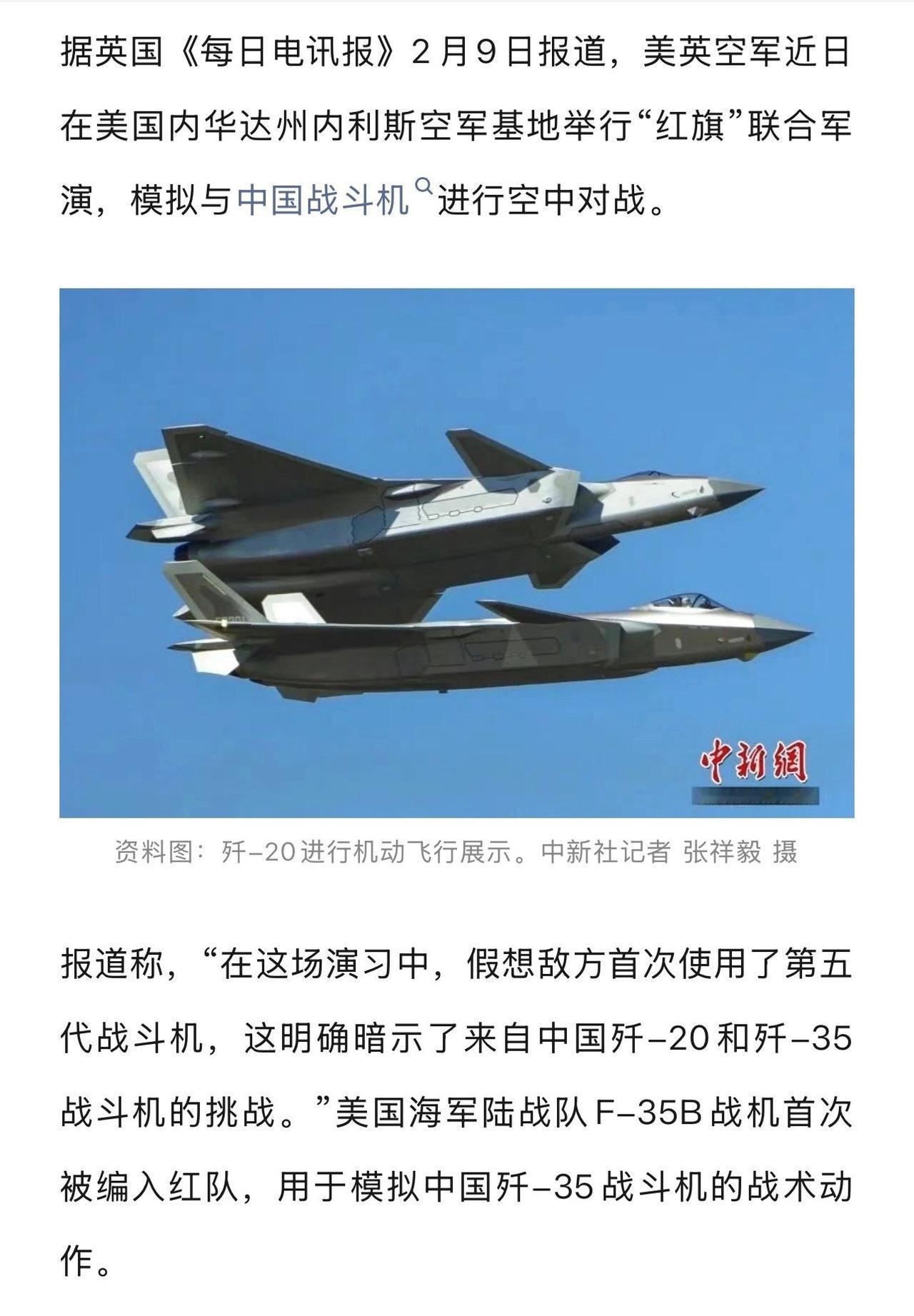 英媒称美英军演模拟对抗中国战机! 据英国《每日电讯报》报道,美英空军近日在美国内华达州内利斯空军基地举行“红旗”联合军演,模拟与中国战斗机进行空中对战。 报道称,美国海军陆战队F-35B战机首次被编入红队,用于模拟中国歼-35战斗机的战术动作。 西方把我们当成模拟对手,说明我们的实力确实变强了,让他们感受到威胁了。