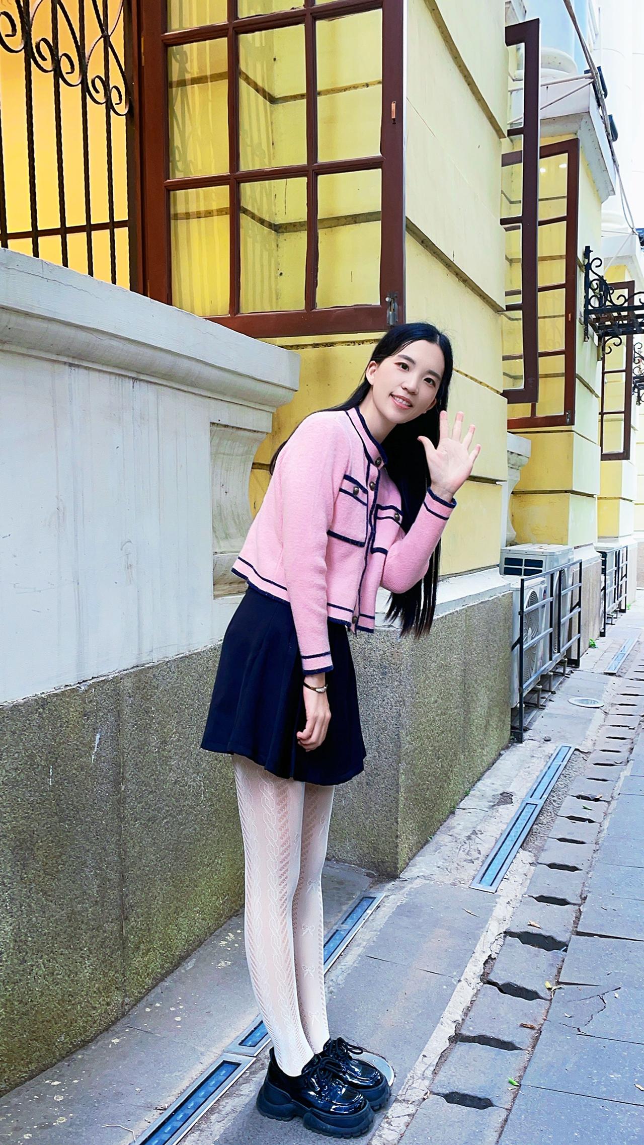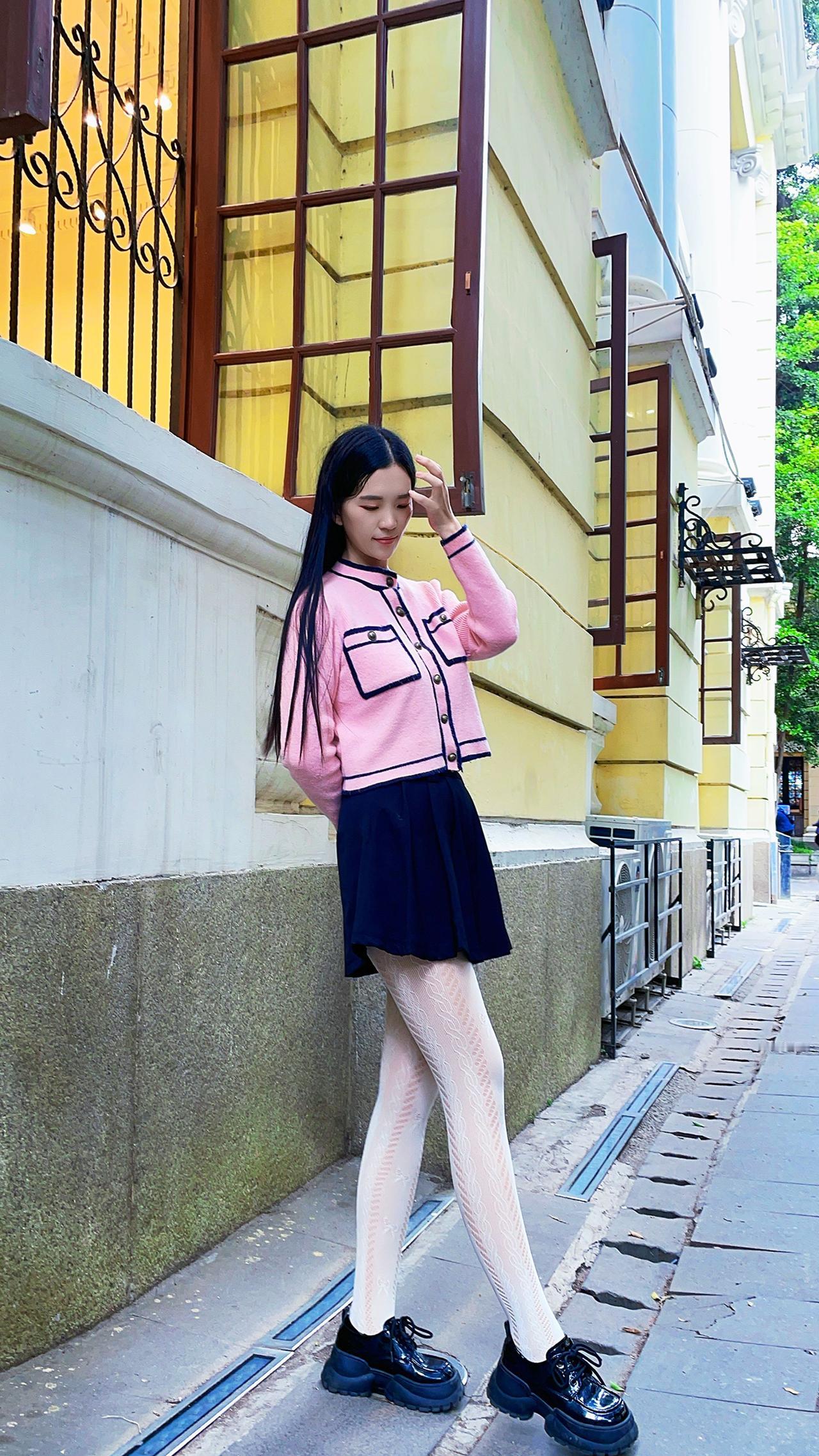 粉色上衣搭配黑色短裙,再配双白丝袜,少女感与女人味兼具~ 美女 白丝袜 欧式建筑 过膝袜