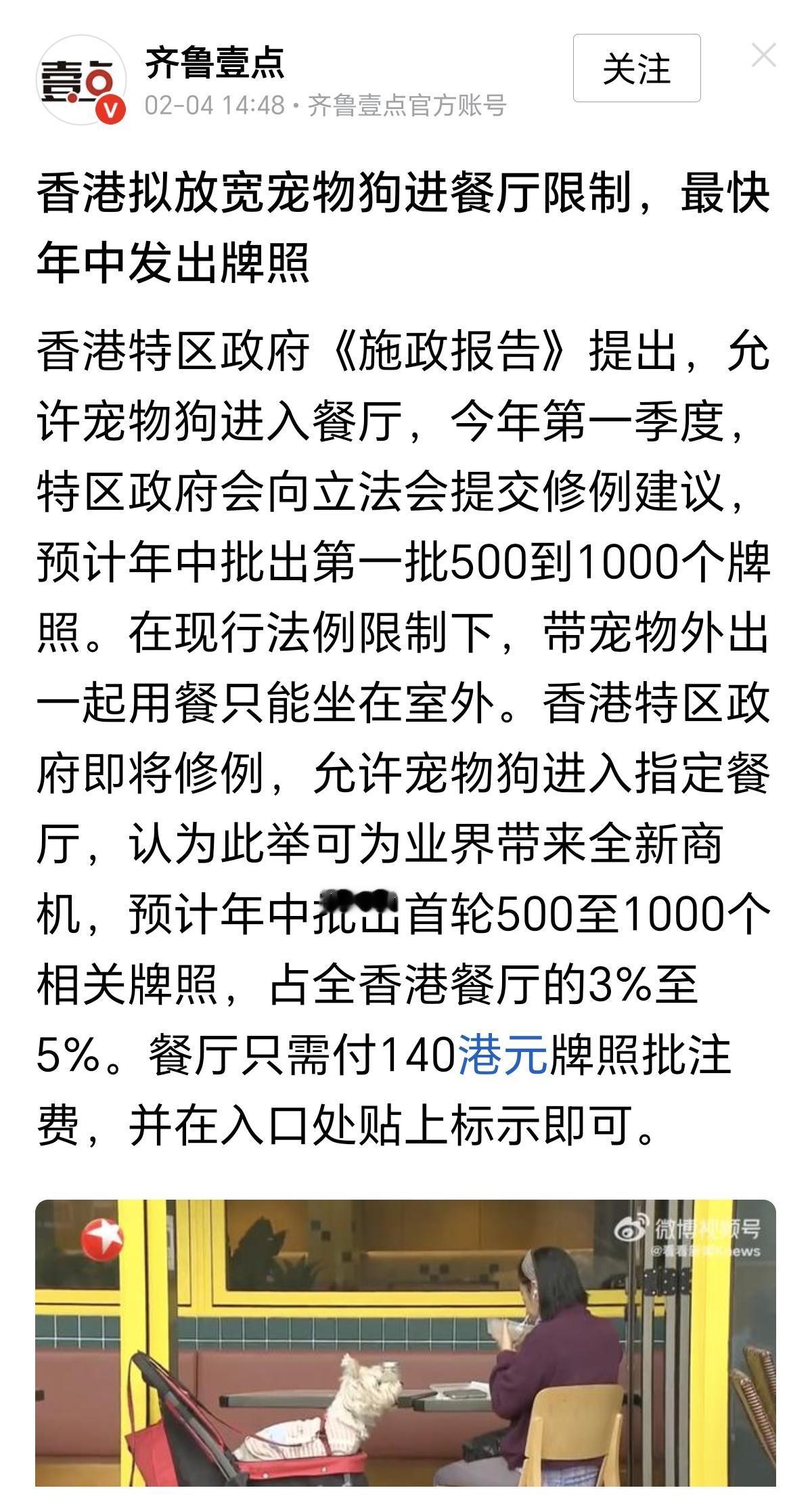 “香港拟放宽宠物狗进餐厅限制”?这是进步还是倒退,从相关规定中,对我们文明养犬有哪些启示? 在香港这条新规实施之前,宠物狗是不允许进餐厅的。 这也正是我们目前所规范的,但为什么香港要放宽这条限制呢? 还是为了商业目的。 随着相关限制的放宽,也有配套的措施。 作为不养狗的人,我是可以接受这条新规的,而相关举措也为我们目前规范文明养犬有些许启示。 1、小范围施行。 这次放宽相关限制,并不是全面铺开,而是这批只给500至1000个餐厅发放牌照。 一刀切是有风险的。 分批次实施,可以根据实施的具体情况,及时调整相关规定,酌情放开限制。 2、消费者有知情权。 规定中明确指出,拿到牌照的餐厅应该在显眼位置标注,该餐厅是允许宠物狗进店的。 这样,消费者事先就有了选择权,是进这家餐厅,还是去别家消费,而不是进店之后才发现有宠物狗在内,引发不必要的纷争。 3、配套相关约束条件。 允许宠物狗进店,但明确了相关规定,例如牵引绳的长度、可进店的犬只类别、不允许爬上餐桌或使用餐具,等等。 4、餐厅不为宠物狗提供服务。 规定指出,餐厅不能给宠物狗准备或者烹饪食物,但可以供应预制菜。 当然,宠物主自备食物也可以。 文明养犬不能靠自觉,必要的约束条款和监督执行是保障。 有的消费者不介意去宠物狗可以进店的餐厅,有的介意。 所以,餐厅会做出选择,明确自己的定位,是否去申请相关牌照,成为“宠物友好”型餐厅。 这是商机,但也同时预示着那些不喜欢宠物狗的消费者不在该餐厅的服务范围之内了。