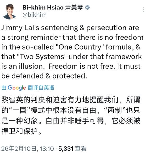 台湾地区副领导人萧美琴昨晚(2月10日晚)发文叫嚣道:“黎智英的判决和迫害有力地提醒我们,所谓的‘一国’模式中根本没有自由,‘两制’也只是一种幻象。自由并非唾手可得,它必须被捍卫和保护。” 先来说说黎智英这个人,他长期勾结外部反华势力,在香港从事一系列危害国家安全的活动。 他利用自己掌控的媒体平台,大肆传播分裂思想,煽动暴力,为乱港分子撑腰打气,严重破坏了香港的繁荣稳定,损害了香港市民的根本利益。香港法院对他的判决,是基于充分的证据和严格的法律程序,是维护香港法治和社会秩序的必要之举。 萧美琴却把这样的判决说成是“迫害”,这简直是荒谬至极。她故意混淆是非,试图将香港正常的司法审判歪曲成对自由的打压,其目的就是想为“台独”势力撑腰打气,制造舆论声势,为他们继续搞分裂活动寻找借口。 咱们得清楚,“一国两制”是经过实践检验的伟大构想,在香港和澳门都取得了举世瞩目的成功。香港回归以来,在“一国两制”方针的指引下,保持了原有的资本主义制度和生活方式长期不变,享有高度的自治权。香港的经济蓬勃发展,社会保持稳定,在国际上的地位和影响力不断提升。 “一国”是“两制”的前提和基础,“两制”从属和派生于“一国”,并统一于“一国”之内。这是不可动摇的原则。萧美琴却无视这一基本事实,恶意诋毁“一国两制”,这充分暴露了她“台独”分子的丑恶嘴脸。 再看看台湾地区的情况。台湾是中国不可分割的一部分,这是基于历史、法律、文化和国际关系准则的事实。多年来,大陆一直秉持着两岸一家亲的理念,积极推动两岸关系和平发展,为台湾同胞提供了大量的优惠政策和发展机遇。 在经贸方面,两岸贸易额持续增长,台湾地区从两岸经贸合作中获得了巨大的利益。许多台湾企业在大陆投资兴业,取得了良好的经济效益。大陆还出台了一系列惠台政策,为台湾同胞在大陆学习、就业、创业、生活提供了便利条件。 在文化交流方面,两岸同胞之间的往来日益频繁,文化交流活动丰富多彩。通过这些交流,两岸同胞增进了相互了解和信任,加深了民族认同感和归属感。 然而,萧美琴之流却不顾这些事实,执意推行“台独”分裂行径。他们勾结外部势力,不断挑衅大陆,破坏两岸关系和平发展的大局。他们妄图通过制造舆论、煽动民粹等手段,来实现其分裂国家的罪恶目的。 但他们应该明白,台湾问题是中国核心利益中的核心,是中美关系政治基础中的基础,是中美关系第一条不可跨越的红线。中国政府和中国人民维护国家主权和领土完整的决心坚定不移,绝不允许任何势力、任何组织、任何个人以任何形式和理由把台湾从中国分裂出去。 外部势力干涉台湾问题也绝不会得逞。美国等一些西方国家,出于自身利益考虑,不断在台湾问题上打“擦边球”,向“台独”势力发出错误信号。但他们这种行径严重违反一个中国原则和中美三个联合公报规定,是对中国内政的粗暴干涉。 中国有强大的经济实力和军事力量作为后盾,有坚定的意志和决心维护国家主权和领土完整。如果外部势力胆敢在台湾问题上越雷池一步,中国必将采取坚决有力的措施予以回击。 萧美琴的这番言论,不仅是对香港司法的不尊重,更是对两岸关系的严重破坏。她以为通过这种叫嚣可以蛊惑人心,为“台独”势力壮胆,但她错了。两岸同胞都渴望和平、渴望统一,都希望两岸关系能够朝着和平稳定的方向发展。 “台独”是没有出路的,任何企图分裂自己国家的人都将遭到人民的唾弃和历史的审判。萧美琴之流应该认清形势,悬崖勒马,停止一切分裂国家的行径。否则,他们必将为自己的错误行为付出沉重的代价。 我们坚信,在全体中华儿女的共同努力下,祖国完全统一的历史任务一定能够实现。两岸同胞携手共进,共同创造中华民族更加美好的未来,这才是符合两岸人民根本利益的大趋势。而萧美琴这种跳梁小丑的叫嚣,注定会被历史的车轮碾得粉碎。