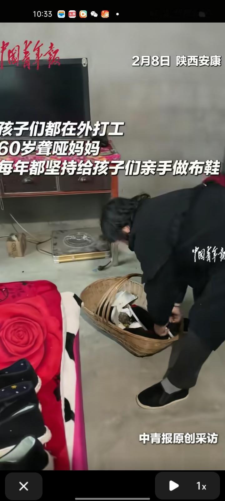 2月8日,安康旬阳市。网友分享一段视频,孩子们都在外打工,60岁聋哑妈妈每年为孩子们亲手做布鞋,就连做饭、织毛衣都是亲自做的。虽然她不会说话,但她对我们的爱,我们心里也能感受到
