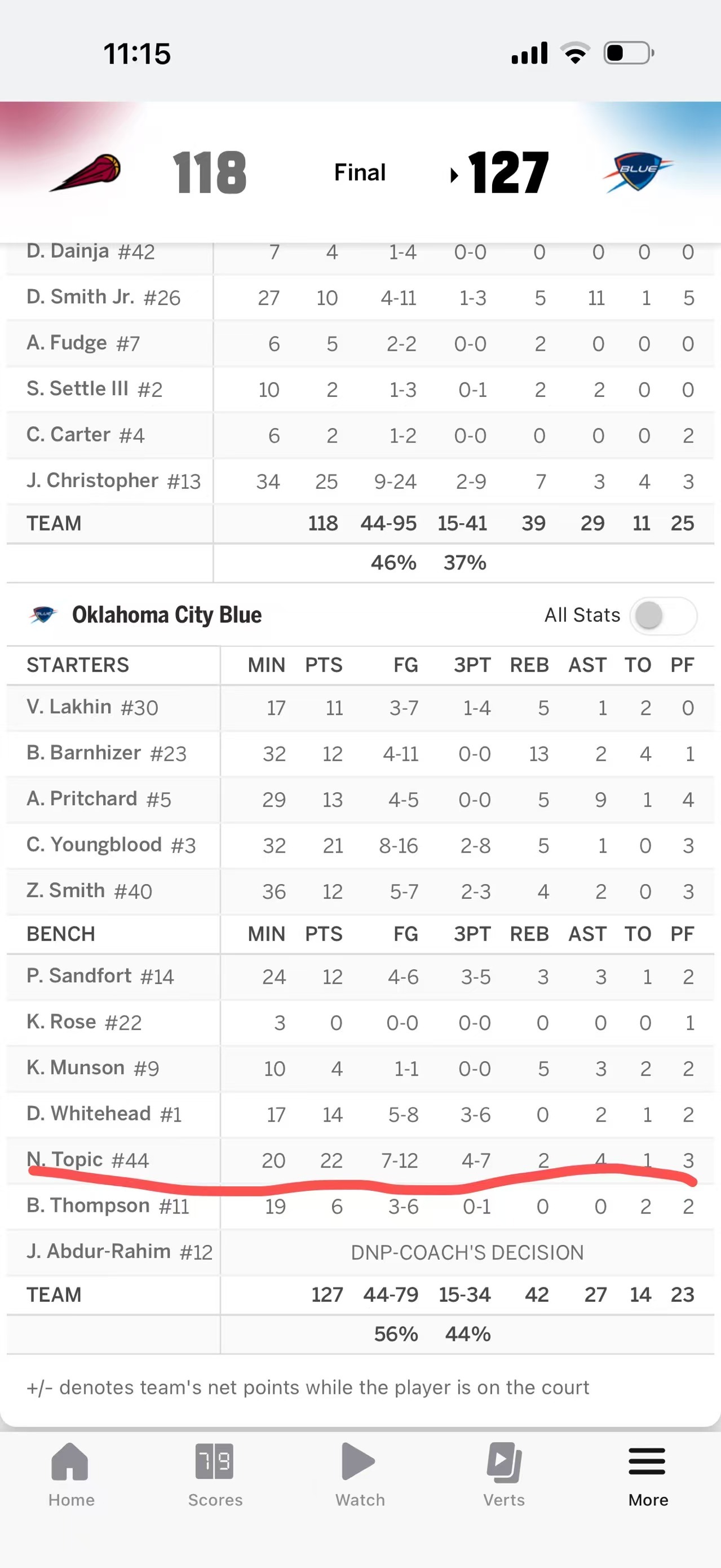 在今天蓝队对阵苏福尔斯天力队的背靠背比赛中,托皮奇表现出色,他替补登场20分钟不到就12中7(三分7中4)爆砍22分4助攻2抢断并且仅有1次失误,带队再次取胜!扬布拉德16中8拿到21+5,巴恩海泽11中4得到12+13的两双!