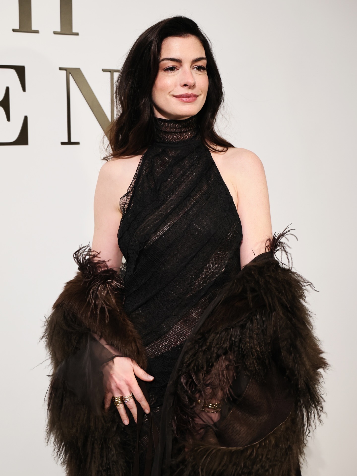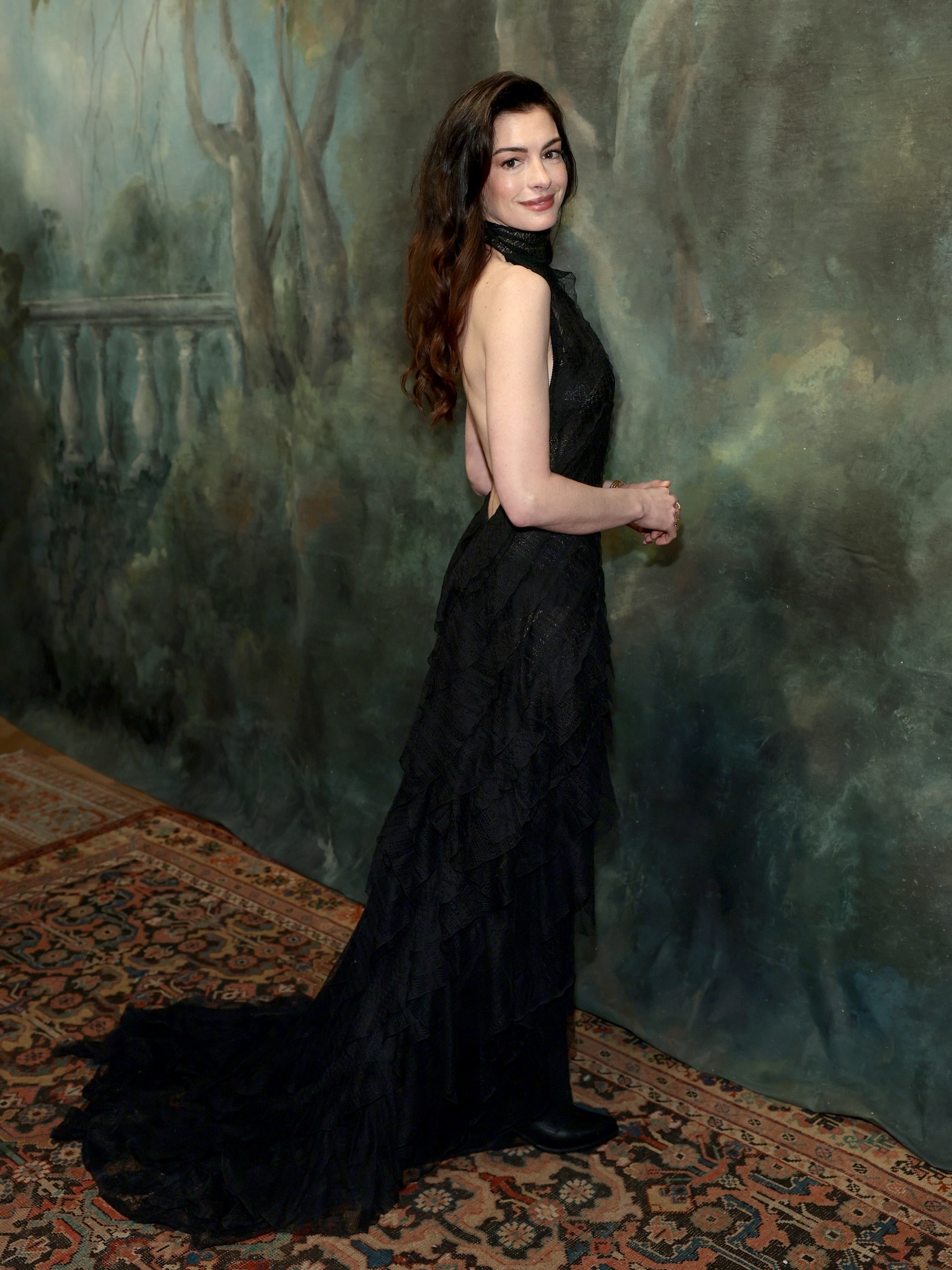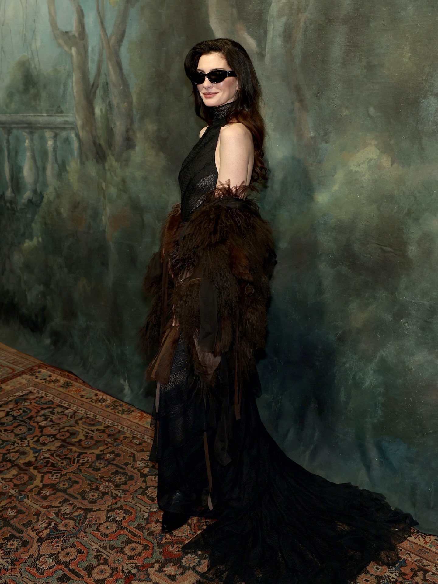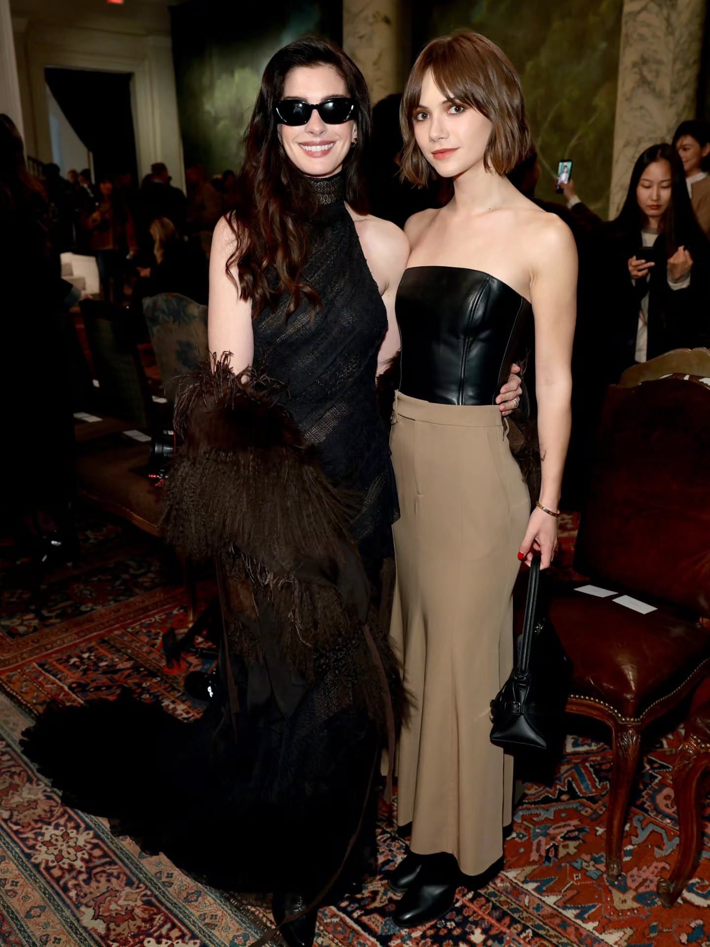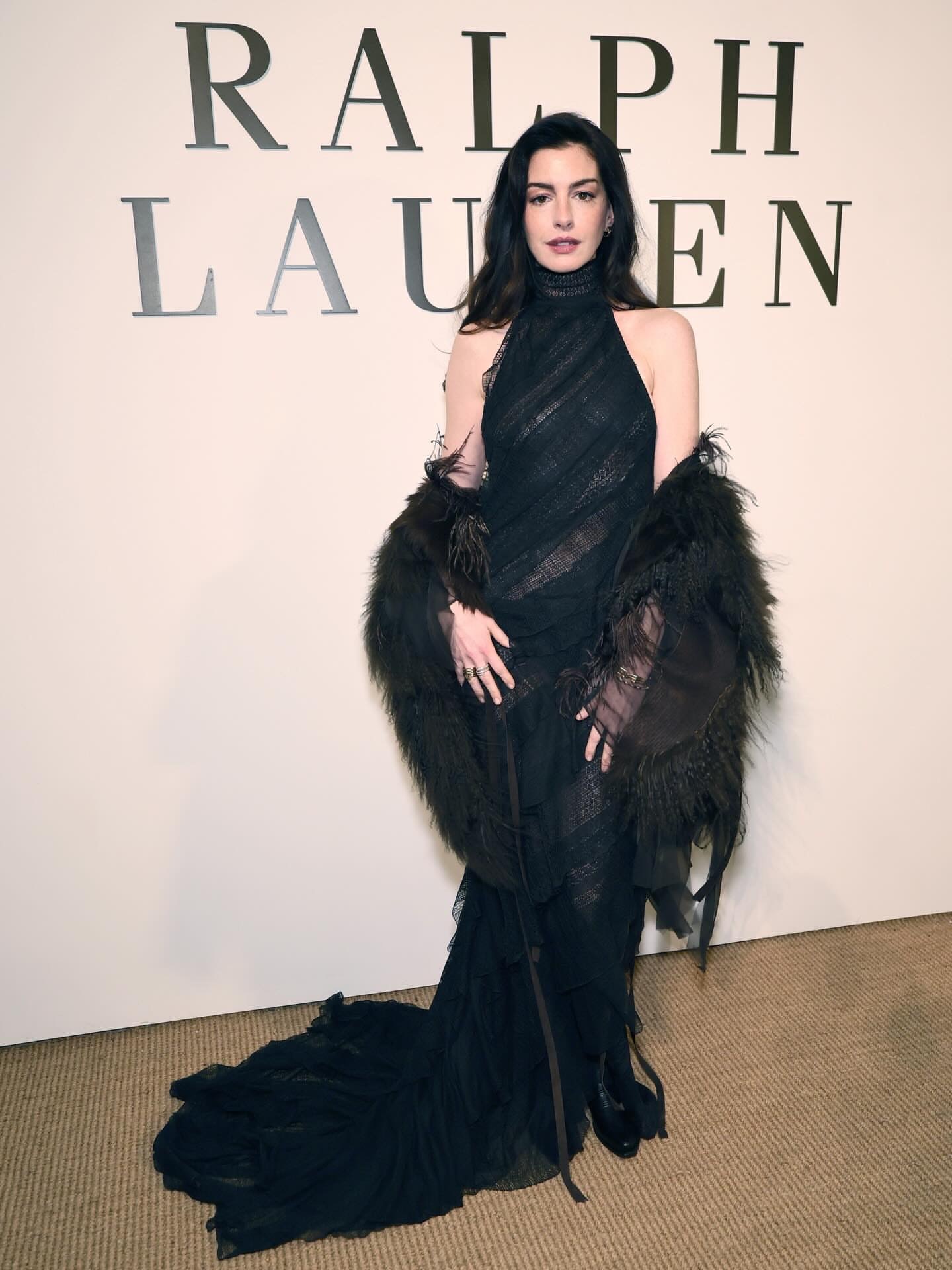 Anne Hathaway出席 Ralph Lauren 2026秋季大秀,美的像画中人一样!她身穿一件黑色高领露背长裙,裙身采用层叠荷叶边设计,既保留了古典礼服的庄重感,又通过轻盈的薄纱材质增添了几分飘逸与浪漫,尽显戏剧张力与复古韵味。时装周纽约时装周