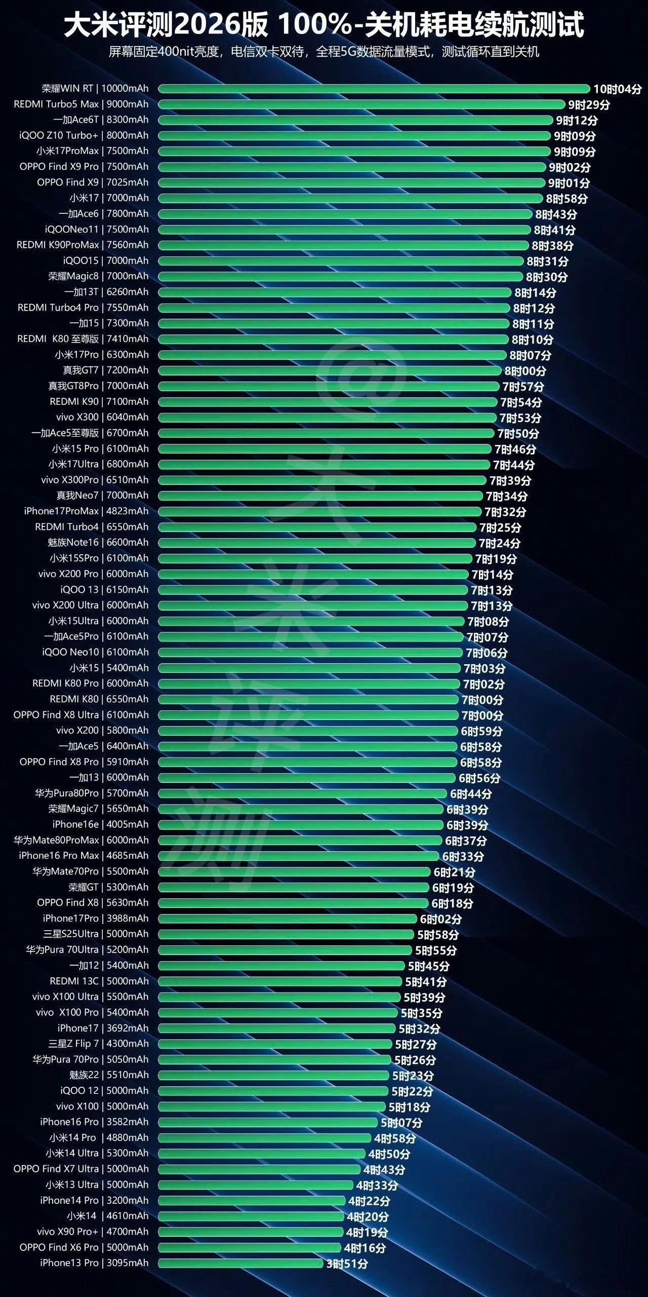 这份由“大米评测”做的测试,条件相当苛刻:屏幕亮度锁死400nit,插着两张电信卡,全程用5G流量刷,直到把手机彻底“榨干”。这模拟的就是你出门在外、重度使用移动网络的最耗电场景,结果很有参考性。