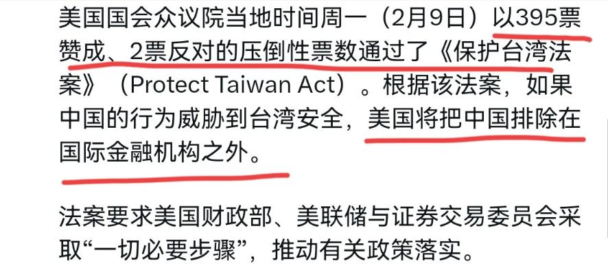 美国完全没有把我们的警告听进去,美国做了一个硬动作声称,如果中国的行为威胁到台湾安全,美国将把中国排除在国际金融机构之外。2月9日,美国国会众议院以395票赞成、2票反对的压倒性票数通过了《保护台湾法案》。根据该法案,如果中国的行为威胁到台湾安全,美国将把中国排除在国际金融机构之外。 说白了,美国众议院395:2高票通过《保护台湾法案》,扬言要将中国排除在国际金融机构之外,表面看是强力护台,实则是践踏国际法、干涉中国内政的霸权闹剧,更是自欺欺人的政治表演。 要知道,2月9日这份法案以压倒性票数通过,核心条款直指“中国威胁台湾安全”就启动金融封杀,这话配上台湾是中国领土的铁一般事实,活像外人闯进家里指手画脚,还威胁要断家里的活路。 可这绝非什么“保护台湾”,而是给“台独”递刀、拱火台海的危险行径。美国明知“台独”是台海和平的最大祸根,却偏偏通过法案给分裂势力撑腰,本质是想借台湾问题牵制中国发展,把台湾当成遏制中国的棋子。 说实话,所谓“金融封杀”根本就是纸老虎。那些国际金融机构里,中国是重要成员,更是全球第二大经济体,对全球金融体系的影响力举足轻重。美国想单方面把中国排除在外,先不说能不能做到,就算真要硬来,全球金融市场必然剧烈动荡,美国自身也会遭受重创。 而这份法案连美国自己都难自圆其说。一边喊着“不支持台独”,一边通过法案给“台独”壮胆,这种自相矛盾的操作,暴露的是美国对华政策的混乱与偏执。真到了要付出实际代价的时候,美国绝不会为“台独”火中取栗。 更关键的是,这是对中国内政的公然干涉,触碰了我们的核心利益红线。台湾问题是中国的家务事,轮不到任何外部势力说三道四。美国国会的这种做法,严重违反一个中国原则和中美三个联合公报规定,只会让中美关系陷入更深的危机。 要清楚,历史上霸权国家靠施压遏制新兴国家的套路从来没成功过。当年美国对苏联、日本搞制裁打压,最终要么两败俱伤,要么没能阻止对方发展。如今美国又想故技重施对付中国,显然是忘了时代已经变了。 而未来,照这个趋势下去,美国还会在台湾问题上持续挑衅,但这些小动作根本挡不住国家统一的历史大势。一方面,中国会坚决反制任何干涉内政的行为,针对法案可能带来的影响做好充分准备,让美国的制裁威胁落空;另一方面,“台独”分子若敢借势妄为,只会加速自身的覆灭。关键转折点就在法案能否真正生效,就算最终落地,也改变不了两岸实力差距,更动摇不了中国捍卫主权的决心,美国终将为自己的霸权行径付出代价。 说到底,美国这份《保护台湾法案》,本质是霸权思维的产物,是注定失败的政治闹剧。台湾是中国不可分割的一部分,任何外部势力的干涉和“台独”分裂行径,都无法阻挡国家统一的历史车轮。中国捍卫核心利益的决心坚定不移,谁敢挑衅,就必然遭到沉重打击! 以上是小编个人看法,如果您也认同,麻烦点赞支持!有更好的见解也欢迎在评论区留言,方便大家一同探讨。