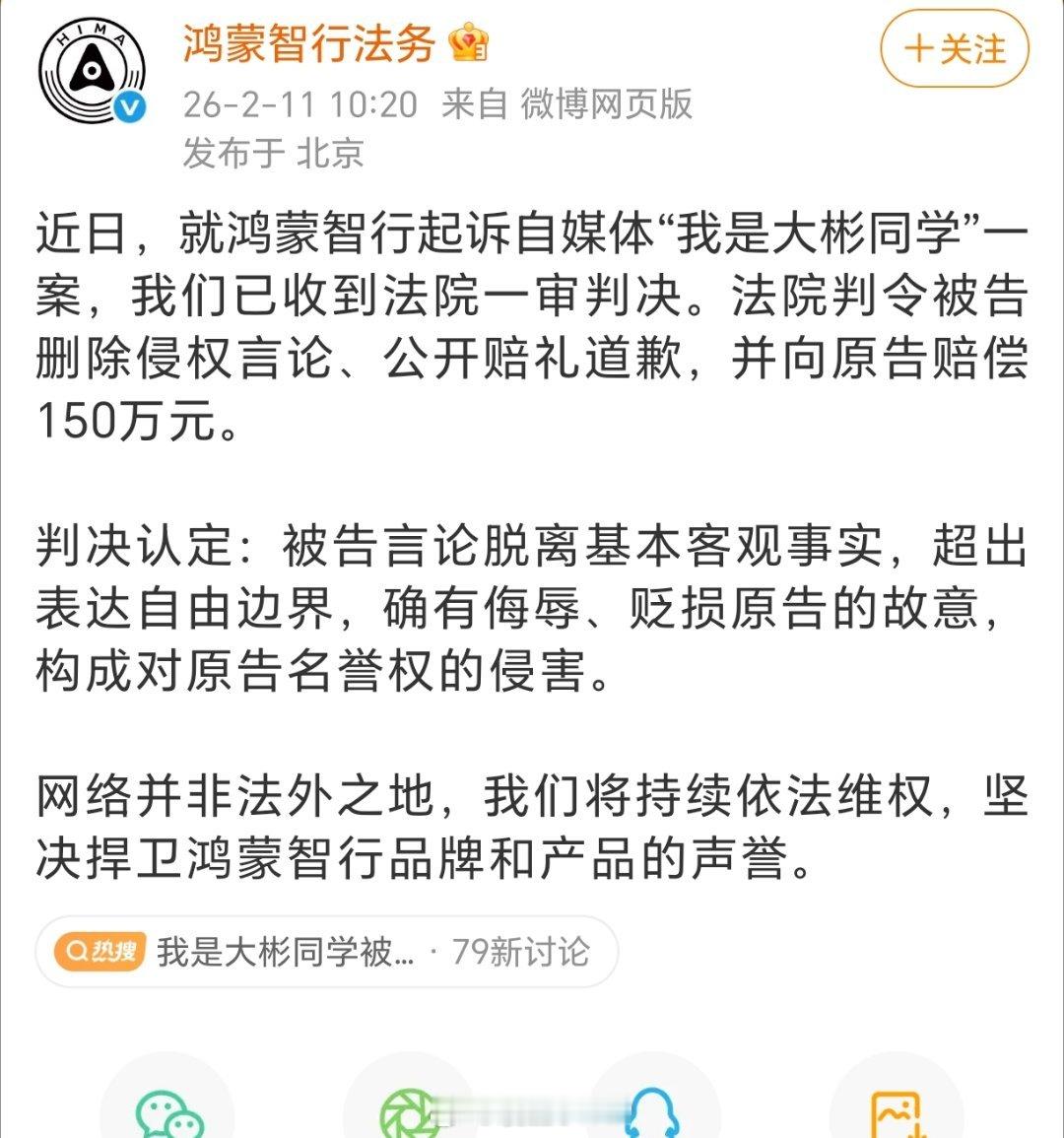我是大彬同学被判向鸿蒙智行赔偿150万 鸿蒙智行法务公布诉“我是大彬同学“案结果:一审判决令其删除侵权言论,公开道歉,并赔偿150万元。