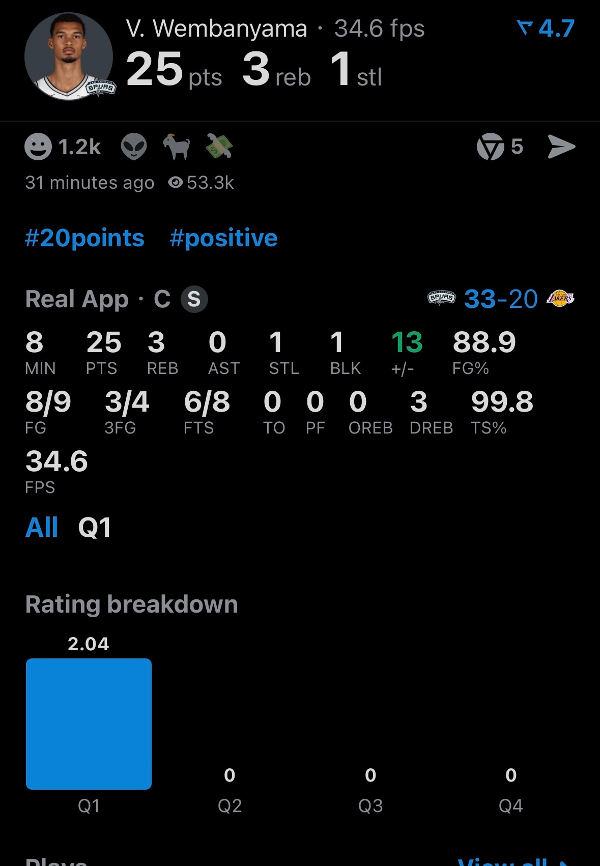 无敌文班,半节就要拉开分差 马刺vs湖人