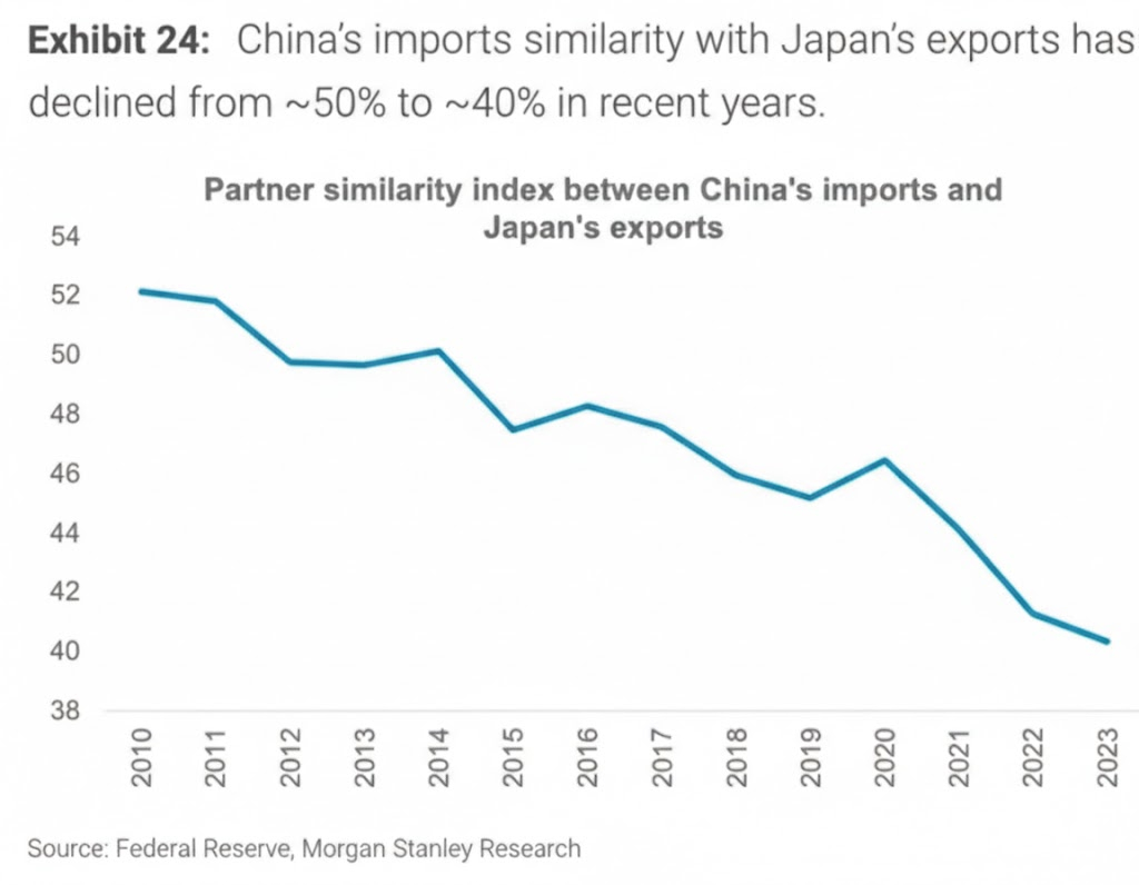 最近在调研中,发现制造业很多领域我们进入到“争锋相对”阶段,然后看到一篇报告,提到中国进口与日本出口的相似度已从约50%降至40%。