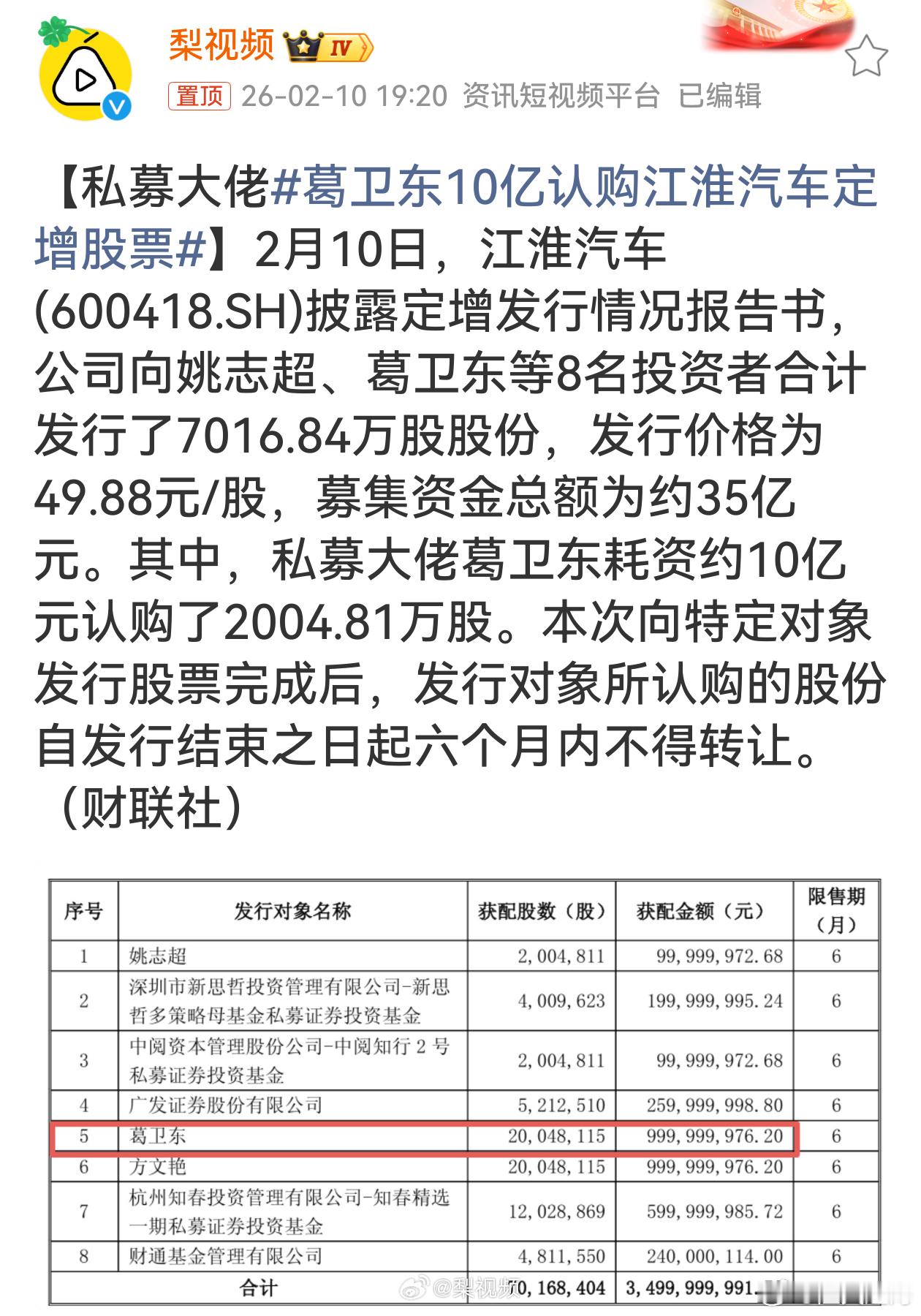 葛卫东10亿认购江淮汽车定增股票葛卫东豪掷10亿认购江淮汽车定增股票,显示出他对江淮汽车未来发展的看好。35亿募资对江淮来说是资金助力,有望推动业务发展。不过定增股有半年锁定期,后续江淮业绩表现及市场行情变化,将影响葛卫东这笔投资最终收益。