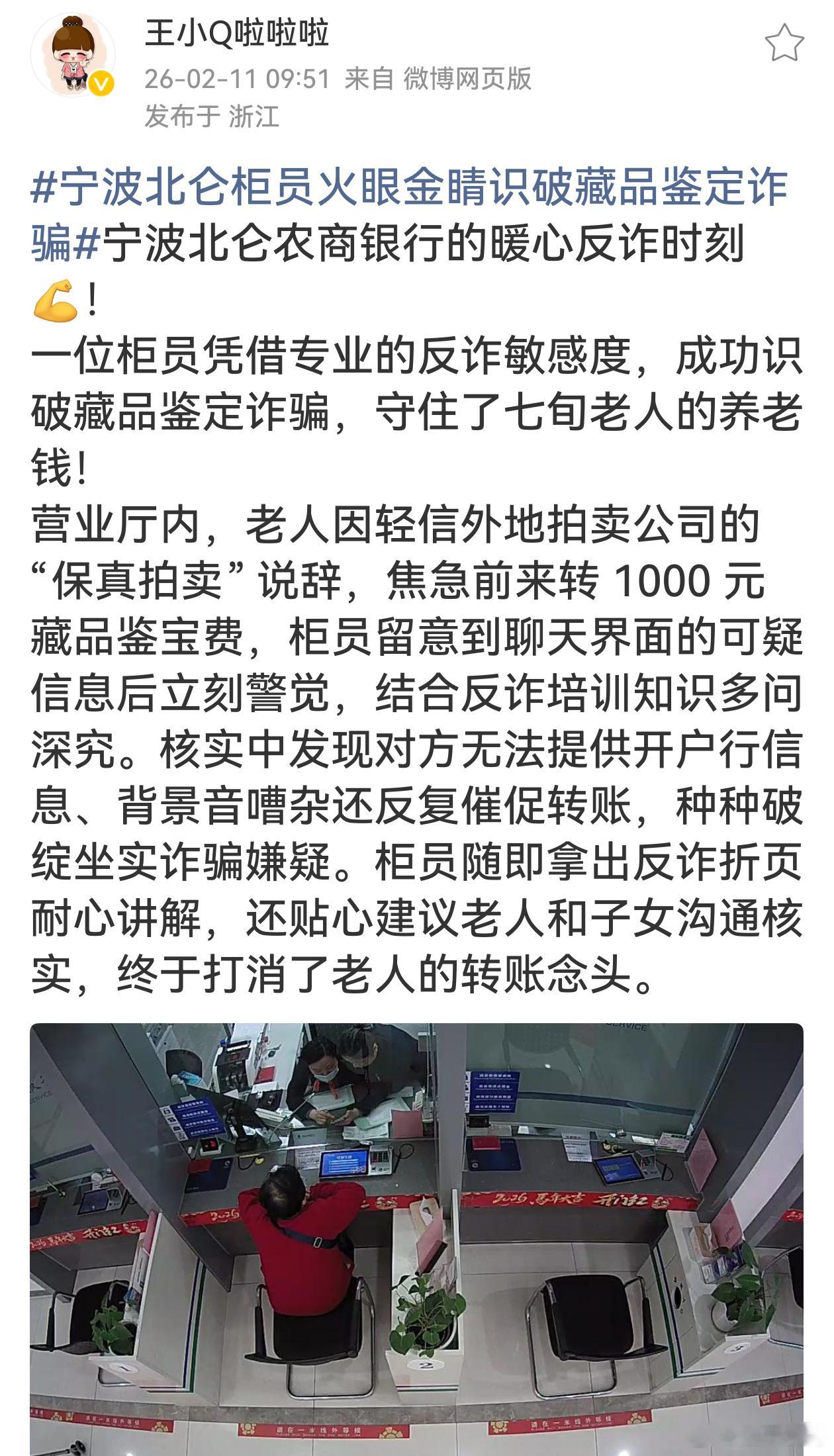 宁波北仑柜员火眼金睛识破藏品鉴定诈骗宁波北仑农商银行柜员火眼金睛,以专业反诈敏感度和责任心,成功识破藏品鉴定诈骗,守护住七旬老人养老钱。在面对可疑转账时,多问深究、耐心讲解,反诈行动暖心又有效,为广大金融从业者树立了反诈榜样,值得点赞!