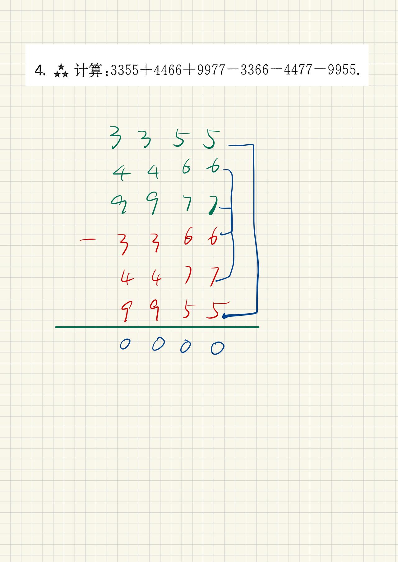 高思数学竞赛导引三年级 01-456 如题,三年级第一讲第 4、5、6 题。 这几道题主要还是考察数位法速算巧算,比如第 4 题,如果列出竖式的话,可以很清晰的看出来加法和减法中,在相同数位上,比如个位、十位、百位、千位上,数字之间相减是相消的,最终结果自然就是 0. 第5 题也是找对应关系,当然,也可以列出竖式,只不过这道题列出竖式的话,书写会比较麻烦,但本质是一样的。