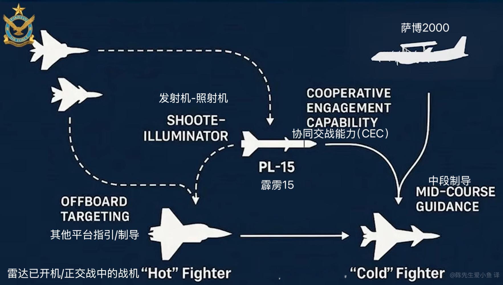 巴基斯坦空军(PAF)最新宣传片中的截图画面证实其具备空中跨平台的协同交战/接战能力(CEC)军用飞机信息汇 由萨博2000预警机+霹雳15发射平台(歼10C猛龙和JF17C枭龙)组成的作战体系和杀伤链会在霹雳15中距空空弹制导全流程中进行“中段制导”即“中段双向数据链修正”,以确保在末段导弹的主动导引头开机能顺利捕获目标。这件事去年包括我在内很多博主/up主说过多次了。原图图1,试译图2
