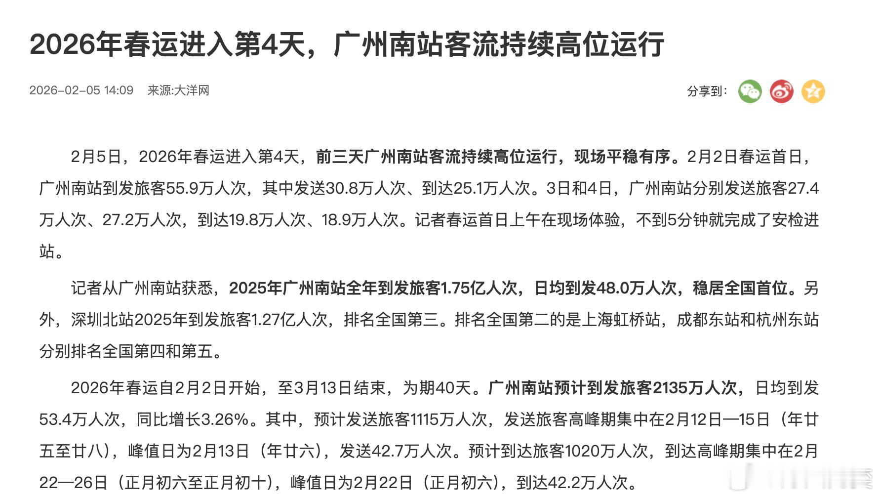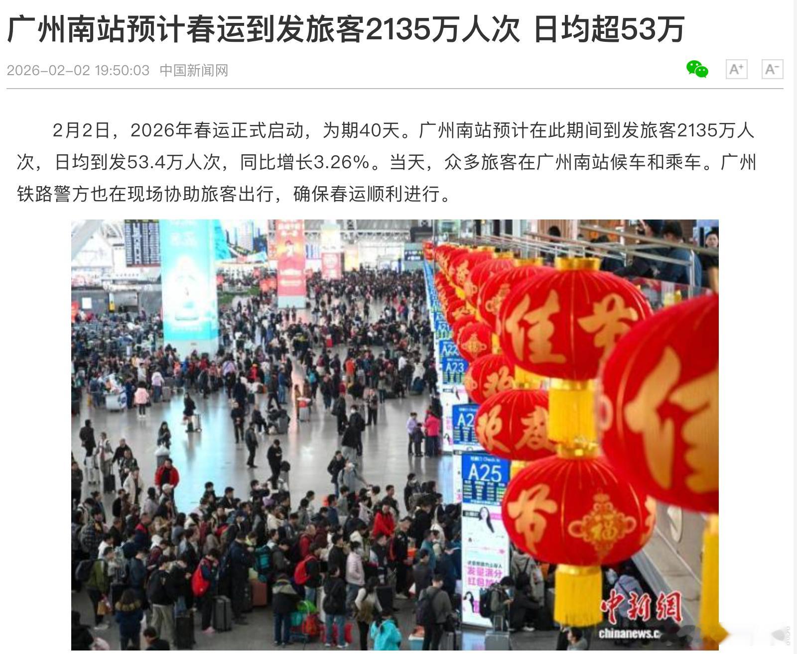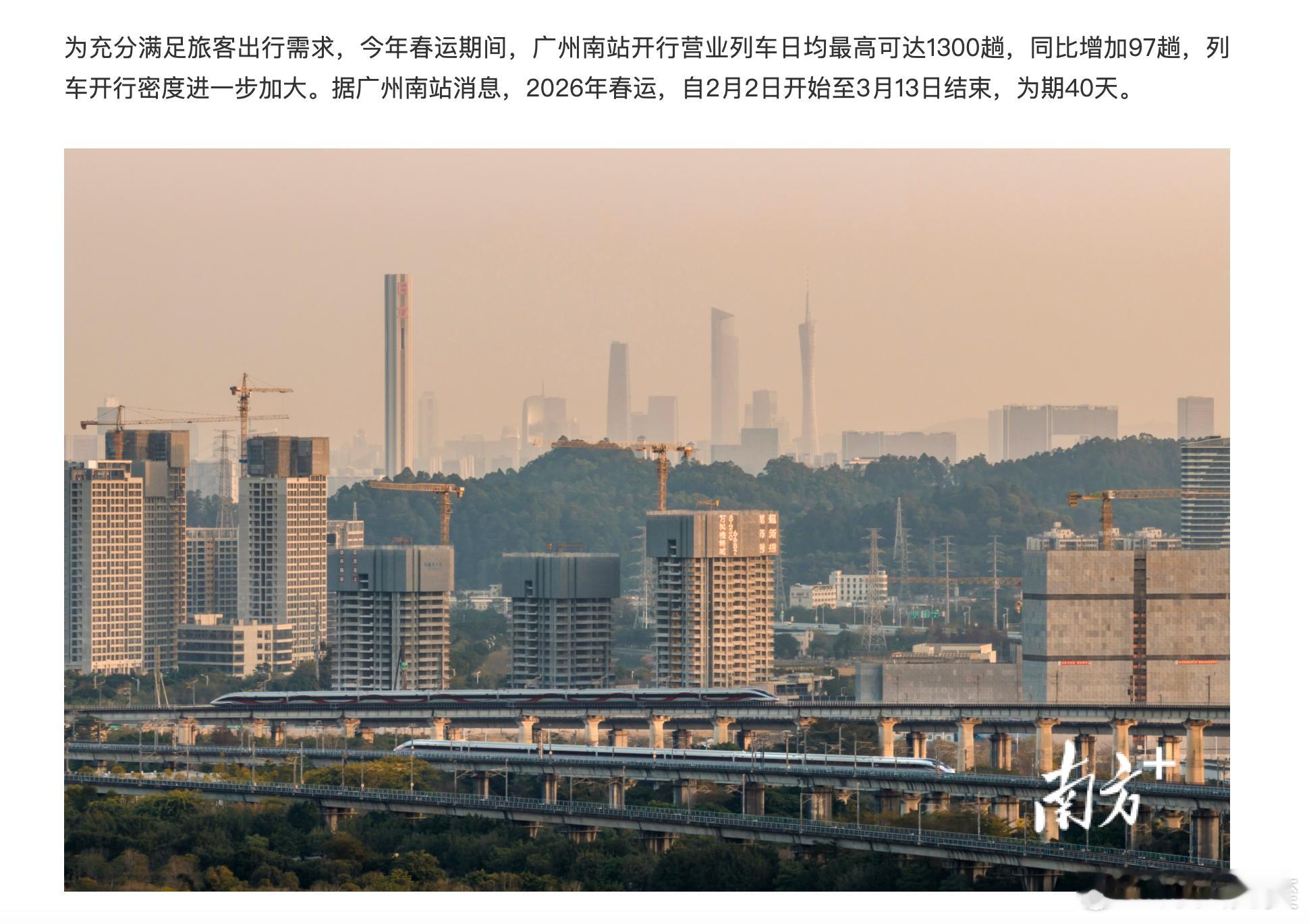 我去看了一下数据,2026年春运,广州南站日均开行营业列车最高可达1300趟,平均下来不到两分钟就要发一班车。深圳北站也是如此,2025年到发旅客1.27亿人次,稳居全国第三。