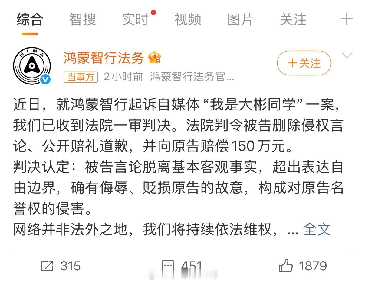 重磅:鸿蒙智行诉自媒体“我是大彬同学”一案已获一审判决:法院责令被告删除侵权内容、公开道歉,并赔偿原告150万元。我是大彬同学被判赔鸿蒙智行150万