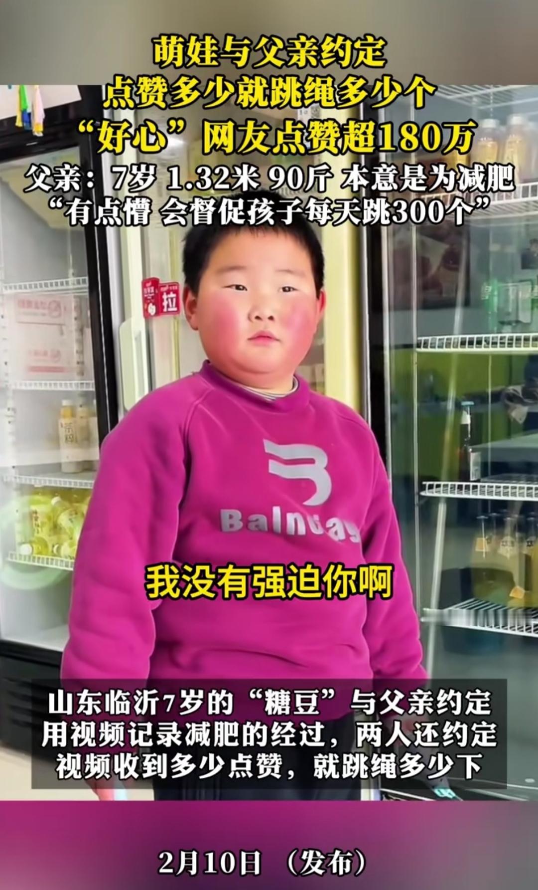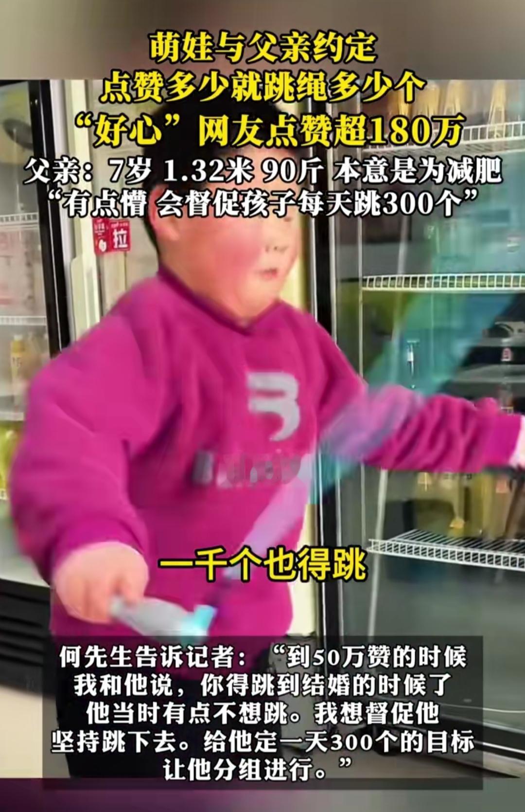 谁能拒绝可爱的人类幼崽啊!本来只是父子间的小约定,结果被网友的热情直接推上热搜,这满屏的欢乐感,真的让人忍不住嘴角上扬。 萌娃和爸爸定下趣味约定,视频有多少点赞就跳多少绳,本以为只是小范围的互动,没想到网友们太热情,直接把点赞干到了180万+,娃和爸爸都直接懵圈了。 原来这是爸爸为了帮娃减肥、完成寒假跳绳作业的小妙招,还定了减肥一斤奖10元的规则,原本轻松完成的小任务,愣是被网友的“宠爱”变成了“大挑战”。 最后爸爸也超暖心,调整了跳绳计划,让娃每天分组跳300下,既守住了约定的初心,又兼顾了孩子的身体。这满满的生活小美好,真的治愈了所有不开心。