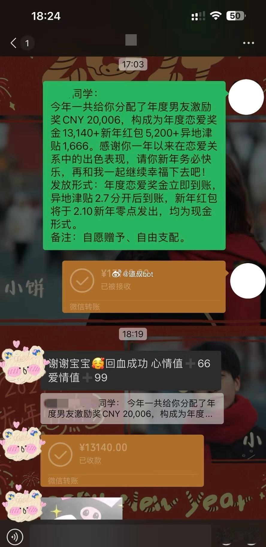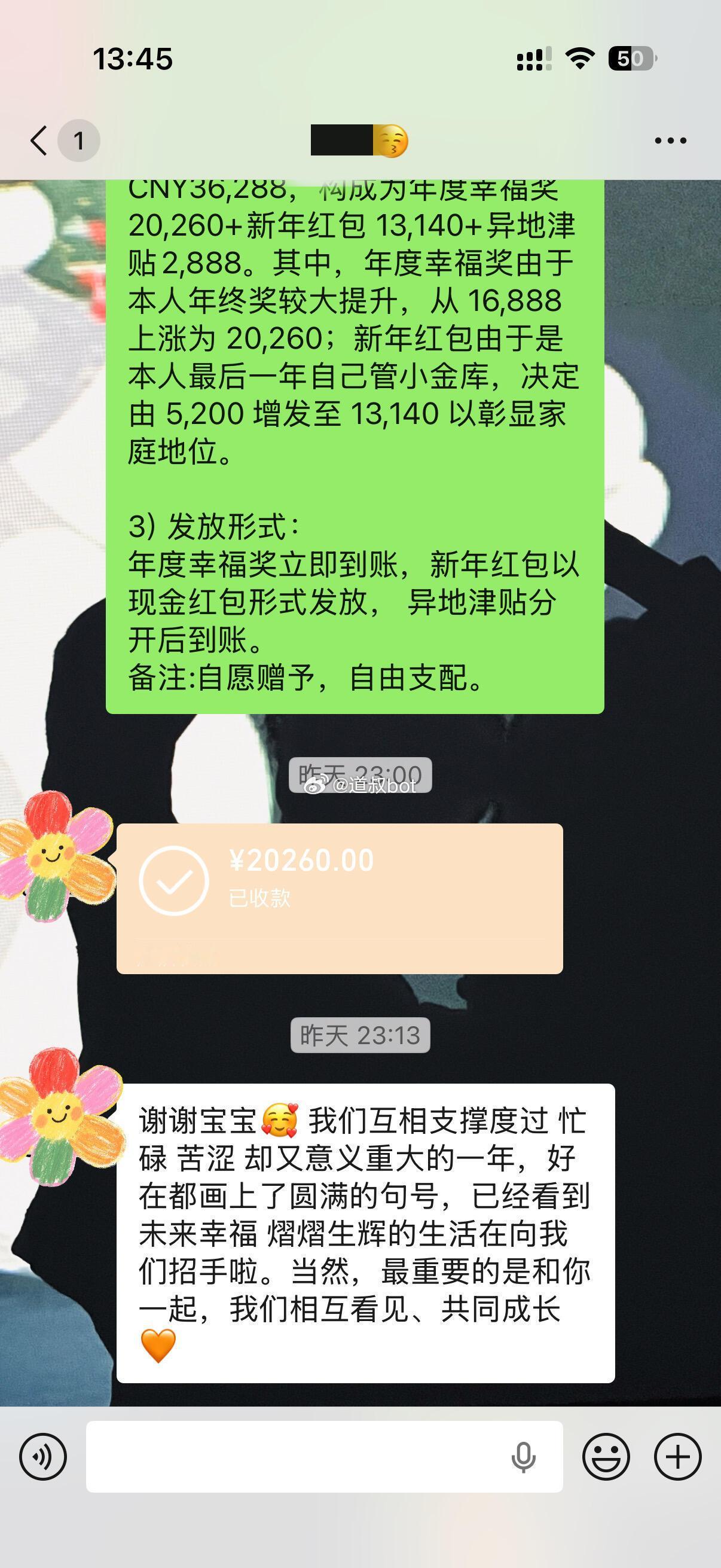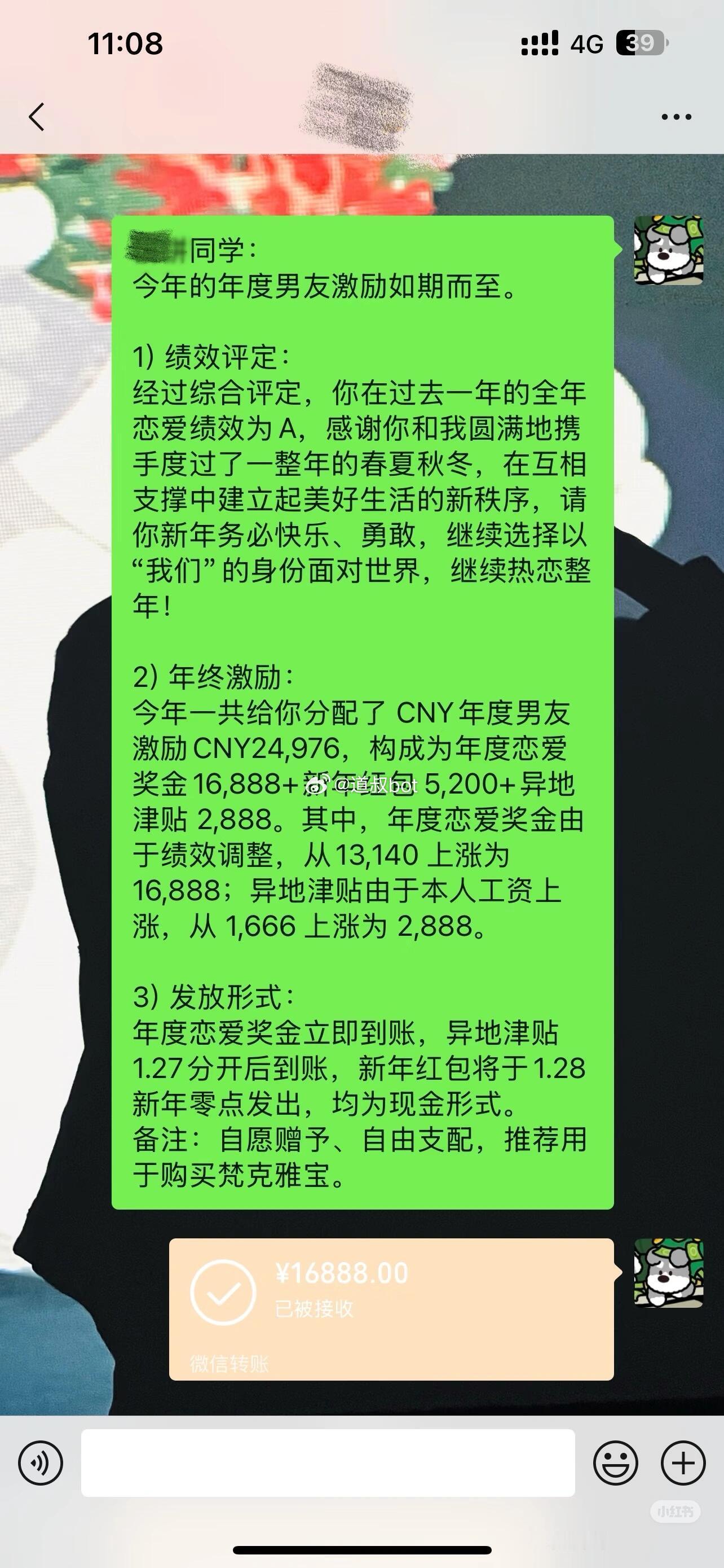 小红书博主称第三年给女朋友发年终奖了,备注自愿赠与,自由支配。