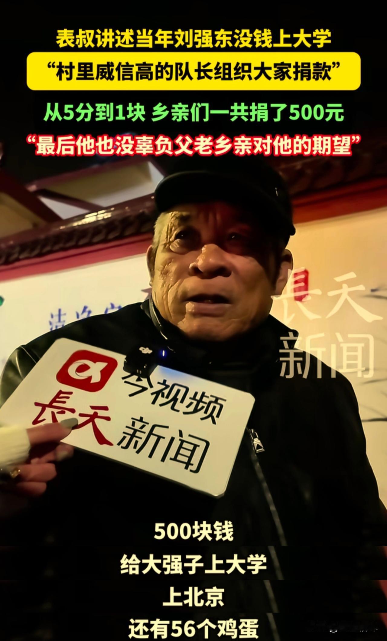 表叔讲述刘强东上大学细节:全村凑500元+56个鸡蛋,凑出一位亿万富翁,如今他用百亿回报家乡 1992年,江苏宿迁光明村,18岁的刘强东以宿迁高考状元的身份,拿到了中国人民大学的录取通知书。这本是全村的大喜事,却让这个贫寒家庭陷入了两难,家里实在拿不出钱供他去北京上学。 “那时候愁啊,大强子是村里第一个考上名牌大学的娃,不能让他因为钱耽误了前程。”近日,刘强东的表叔在接受长天新闻采访时,回忆起那段往事依旧动容。 面对其家庭的困境,村里威信高的老队长得知后,主动站出来组织村民们捐款。在那个物资匮乏的年代,乡亲们的日子也都紧巴巴的,大家你家出2毛,我家出1毛,甚至还有人拿出了压箱底的5分钱。 “最多的一户也就捐了1块钱,就这还是人家省了好几天的口粮。”表叔说,就这样,全村人东拼西凑,硬是凑出了500元现金,还有56个带着体温的土鸡蛋。 这500元,是乡亲们从牙缝里挤出来的希望,这56个鸡蛋,是那个年代最珍贵的营养品。村民纪长胜的妻子煮了两个熟鸡蛋,连同卖鸡蛋攒下的5毛钱一起送出,村民周长青也送出了5毛钱和一个鸡蛋。 刘强东揣着这笔“巨款”和一兜鸡蛋,踏上了北上的火车。他计划用它支撑四年的大学生活,心里暗暗发誓:“我一定不能辜负父老乡亲的期望。” 三十多年过去,当年那个背着鸡蛋进京的少年,早已成长为京东集团的创始人。而他从未忘记过家乡的恩情。这些年,刘强东不仅为家乡修路、建学校、办工厂。 连续多年春节都要回到光明村,为全村每户人家发放年货,并为60岁以上老人每人发放1万元现金红包。为了感恩师长,曾给自己小学的每位老师发放10万元现金红包。 为了反哺家乡,他将京东全国客服中心、科技园等重大项目落户宿迁,为当地创造大量就业,真正变“输血”为“造血”。 “他真的没辜负这个父老乡亲对他的期望,佩服我大强子。”表叔自豪的对记者说到,眼里满是骄傲,“现在村里的日子越来越好,都是托大强子的福。他是我们全村的骄傲。” 从5分钱的捐款到如今的亿万回馈,刘强东用行动诠释了什么是“滴水之恩,涌泉相报”。这份跨越三十多年的乡土温情,不仅温暖了一个村庄,更让我们看到了企业家的责任与担当。 刘强东 刘强东品牌价值