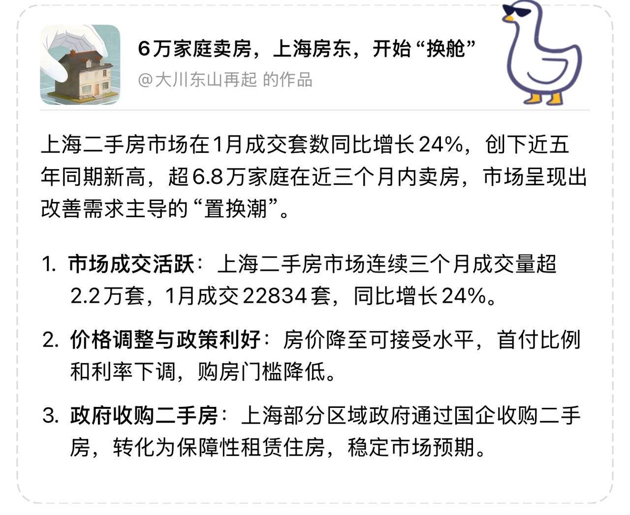 二手房1月成交涨24%创5年新高,置换潮真的来了?这波能上车吗? 刚看到上海1月二手房成交破2.2万套,同比涨24%,近三个月超6.8万家庭换房——作为在上海琢磨置换的妈妈,这热度我可太懂了! 突然火成这样?这是什么情况? 房价没那么疯了,首付降了、公积金利率才2.6%,税费还减免,300万以下刚需房直接卖爆,门槛低了谁不心动? 最关键是浦东、静安这些核心区,国企直接收老旧小户型当保租房,全款买!咱置换的家庭不用愁“卖旧等回款”了,卖了老破小直接换改善房,链条通了,置换潮能不起来吗? 现在是分化行情,中环内300-800万的优质房流通快,老破小、远郊房还是难卖,置换得盯着核心地段。 刚需现在入场门槛低、选择多,尤其是有学区需求的,趁这波“小阳春”赶紧看。 置换别贪快,先把自己的老房子挂靠谱中介,国企收储的小户型抓紧出,回款快才能换好房。 我家邻居刚把浦东老破小卖给国企,全款拿到手直接换了徐汇的三居,娃上学、自住一步到位,这波新政就是给咱置换家庭铺路的! 上海二手房这波“开门红”不是虚火,刚需、置换现在是窗口期,但别乱买,盯着优质房、核心区准没错!