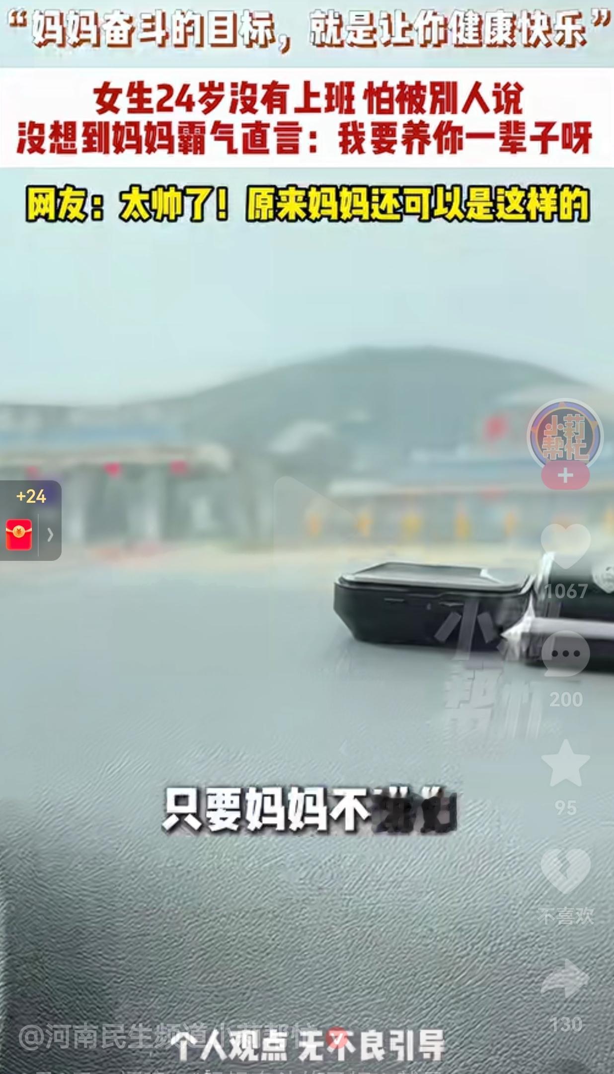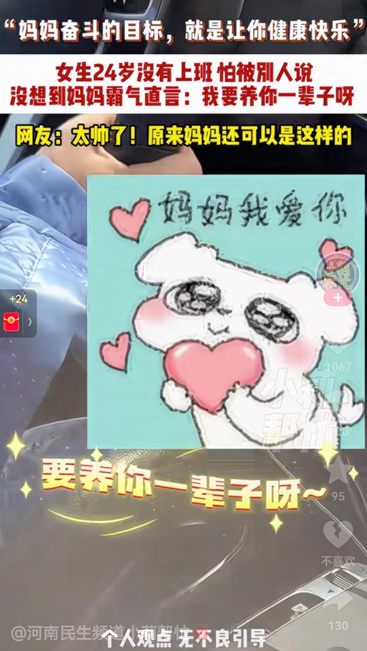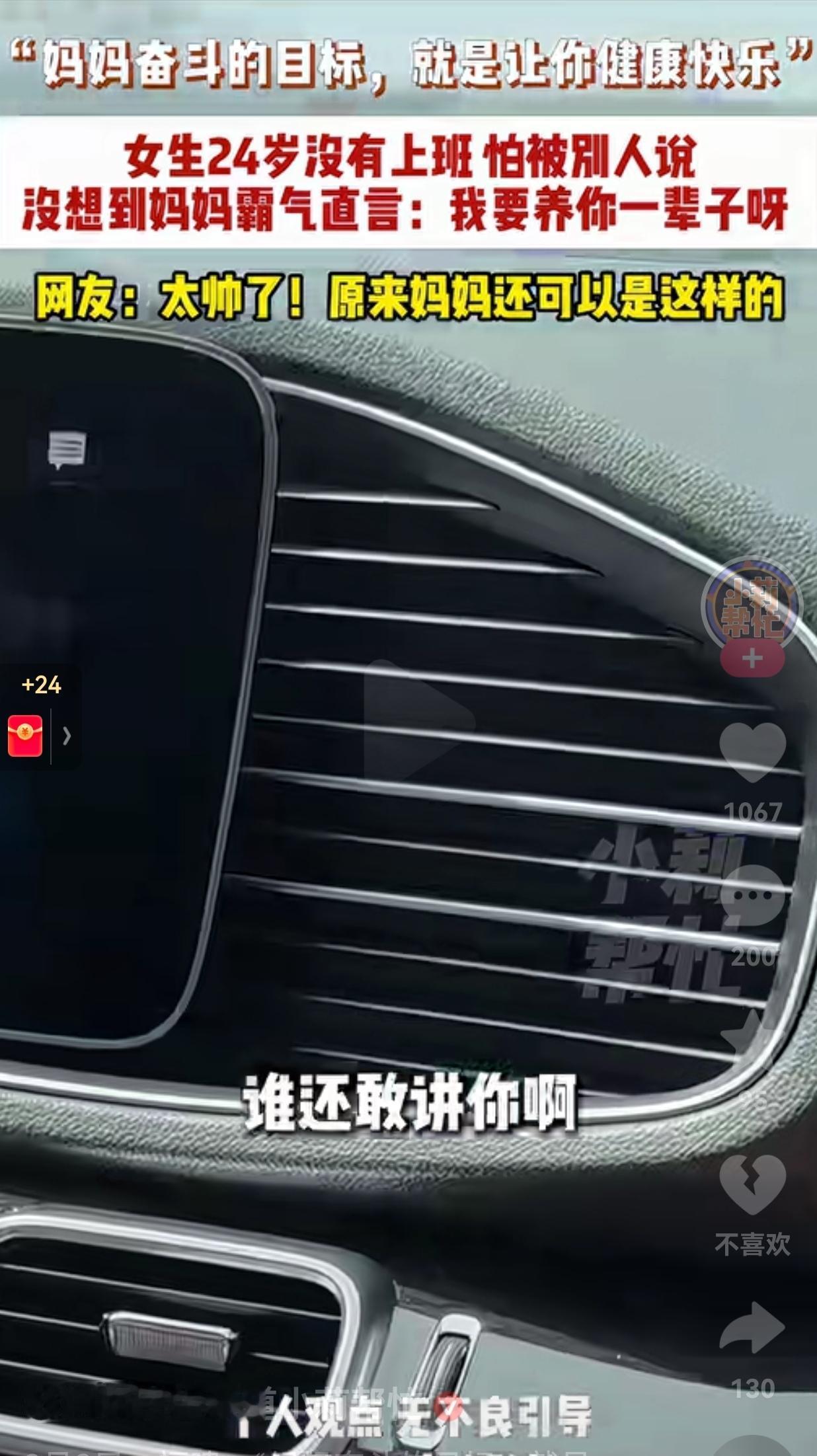 这位妈妈给孩子的安全感也太足了吧?2月9日,福建,一段母女的对话,真的戳中人的泪点。 24岁的女生因为暂时没上班,没有找到适合的工作,心里一直发慌,总怕被亲戚朋友说“谁家姑娘不务正业,一直让父母养着,在啃老”。 她坐在副驾,小声跟妈妈念叨自己的焦虑:“我现在没上班,那你不怕别人讲我吗?” 没想到正在开车的妈妈,连头都没回,语气特别霸气,直接甩出一句:“我要养你一辈子呀。” 女生一下子没反应过来,以为自己听错了,赶紧追问:“妈妈你刚刚说啥?你再说一遍,刚刚没听清吗?” 妈妈笑着重复:“我要养你一辈子。” 女儿说:“真的吗?你不怕别人说我吗?” 妈妈说:“当然是真的啦。为什么要怕?只要妈妈不讲你,谁还敢讲你啊?你也不用去看别人老板的脸色,也不用早起晚归,妈妈奋斗的目标,就是让你健康快乐地活着,不想干嘛就不干嘛,想干嘛就干嘛。你只要做妈妈开心快乐的小公举就好了。” 女生当场破防,带着哭腔喊了一句:“天呐!哈哈哈你太帅了!好的!” 说实话,我刷到这个视频的时候,直接鼻酸了。 24岁的年纪,说大不大,说小也不小了。身边的人好像都在按部就班的规划着自己的未来,有的人在考研,有的人在考公,还有的人在找工作,甚至有的人已经结婚生子。只要你稍微比别人慢半拍,就会被贴上不上进、没出息的标签。 我们从小被教育要优秀、要争气,却很少有人告诉我们:“就算你不优秀,我也一样爱你。” 就像这个女生,她怕的不是没工作,而是怕让妈妈失望,怕被别人的眼光绑架。可妈妈的一句话,直接把她从这种焦虑里拽了出来:“你不用活成别人期待的样子,你只要健康快乐,就够了。” 有网友评论:“太帅了!原来妈妈还可以是这样的。” 还有的网友说:“我也好想有个这样的妈妈,不用再怕被说啃老,不用再逼自己硬撑。” 可能,很多人看到“妈妈养你一辈子”,第一反应是“这也太溺爱了吧?这孩子以后可怎么办? 可我觉得,这根本不是溺爱,而是最清醒的爱。 妈妈说的“养你”,不是让你一辈子躺平,而是告诉你:“你不用急着证明自己,不用为了生计去做不喜欢的事,不用在焦虑里内耗。你可以停下来,可以迷茫,可以重新选择。” 她给的不是一张长期饭票,而是一份“被兜底”的安全感。有了这份安全感,你才敢去试错,才敢去追求自己真正想要的生活,而不是被“必须成功”的压力压得喘不过气。 就像妈妈说的:“妈妈奋斗的目标,就是要让你无忧无虑地活着。” 这句话,比你要出人头地、你要赚大钱,重一万倍。 在这个快节奏的社会,很多人真的太容易被外界的声音裹挟了。 别人说30岁之前要结婚,我们没有结婚,就慌了。别人说没房没车就是失败,我们没房没车,就开始焦虑了。别人说没有工作就是啃老,我们就自卑了。 可我们忘了,妈妈的爱,从来都和这些标签无关。她爱的,从来不是那个优秀的你,而是那个真实的你。 针对此事,你有什么看法呢?欢迎大家评论区讨论留言。