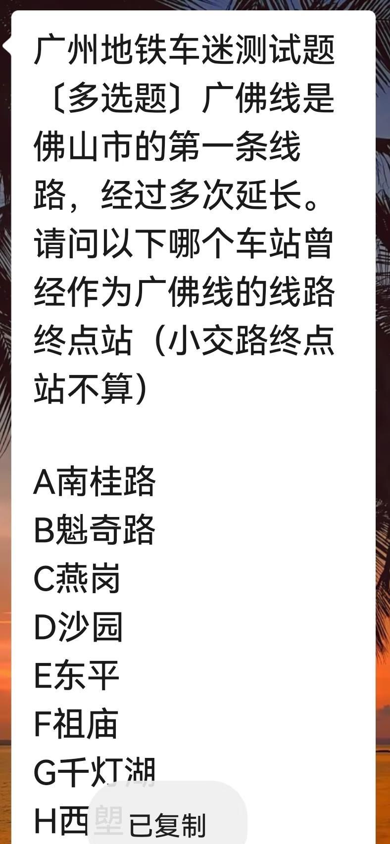 广州地铁车迷测试题42.0,广佛线曾经的终点 广州地铁车迷测试题 〔多选题〕广佛线是佛山市的第一条线路,经过多次延长。请问以下哪个车站曾经作为广佛线的线路终点站(小交路终点站不算) A南桂路 B魁奇路 C燕岗 D沙园 E东平 F祖庙 G千灯湖 H西塱 交通 火车 轨道交通 地铁 广州 广州地铁 地铁站 考试