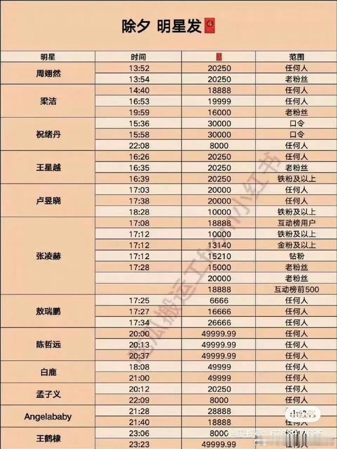 明星除夕发红包网传明星除夕发红包 如果网传的明星除夕分组发红包是真的,那今年的“年终奖”可能来自偶像哦!这大概是粉丝能想到的、最惊喜的跨年礼物之一了吧!