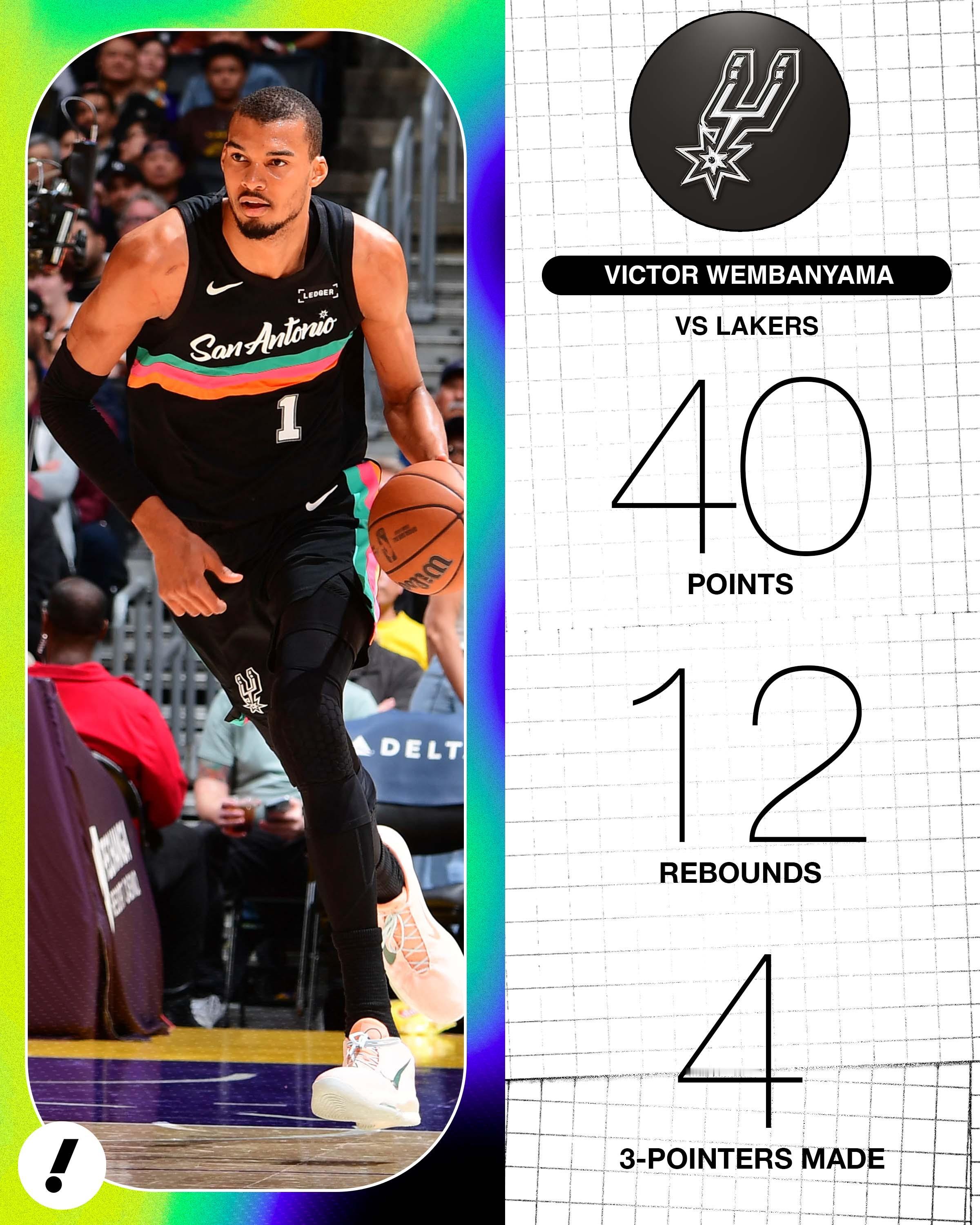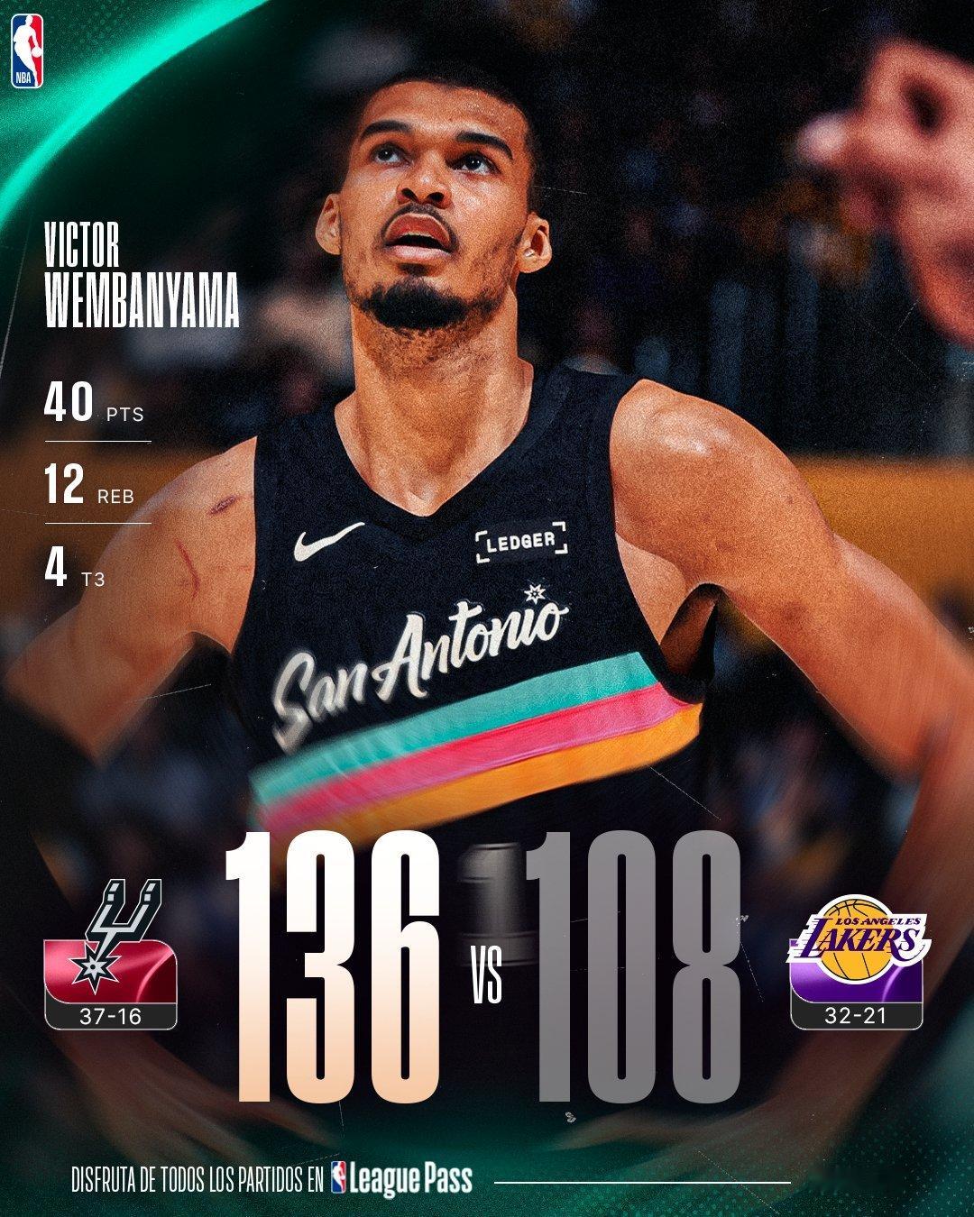 ——全场出战三节26分钟——投篮20中13,三分6中4,罚球12中10——拿下40分12篮板2助攻2抢断1盖帽——第一节单节出战8分钟狂砍25分,半场37分——马刺136-108大胜湖人