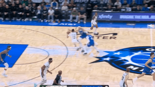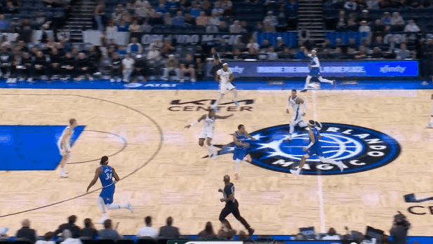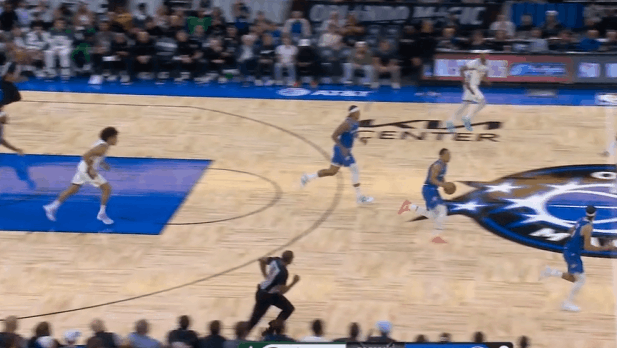 P5布莱克超高位置直接无球启动空切,长驱直入凭借速度直接摆脱罗林斯,接萨格斯传球后起跳滞空迎着回收补篮的托马斯挑篮打进。