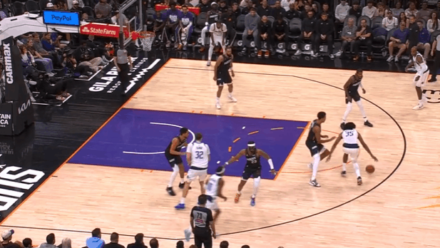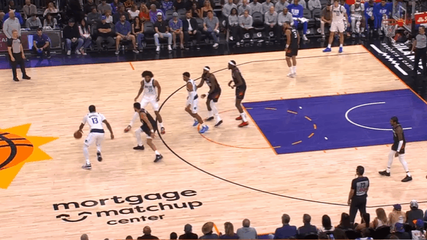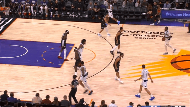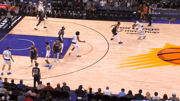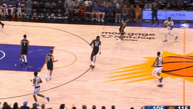 P3持球推过半场后立即抓早攻单打布克:推球变向换到右手后起速突破冲击,行进间沉肩主动寻求对抗碾着布克杀入篮下后后仰抛投打板造成干扰球。