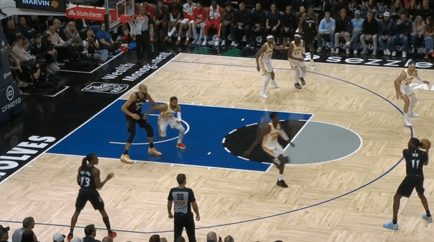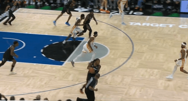 P2多森姆持球推动反击,中线起速快速推进行进间面对退防的沃克:右手大力炸球后立即撩起手臂合球向左路起步——造犯规+攻击防守人前侧脚——直杀篮下,沃克忌惮被制造犯规只好躲开,多森姆轻松上篮打进。