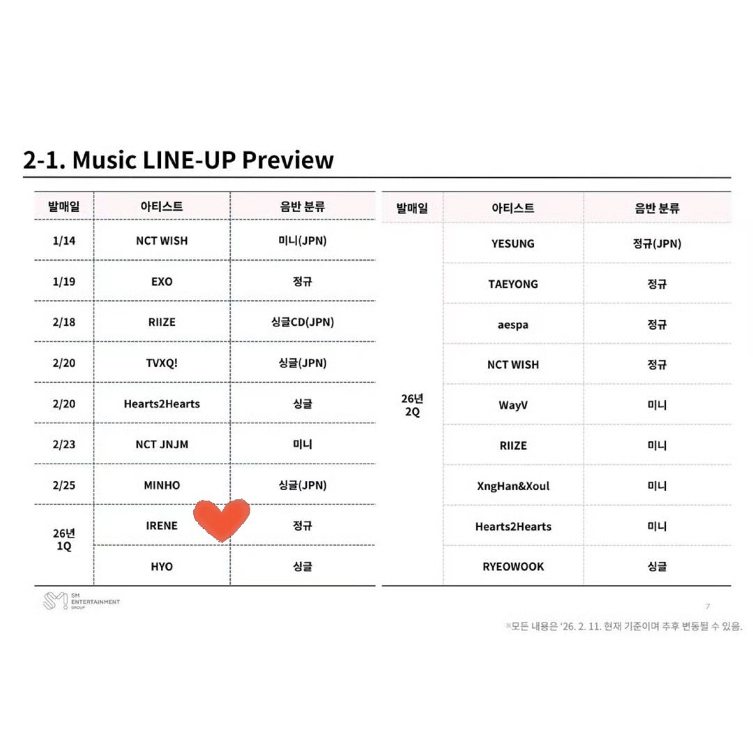 Irene将第一季度回归Irene第一季度SOLO回归根据sm2026上半年企划表,IRENE将在第一季度携solo专辑回归