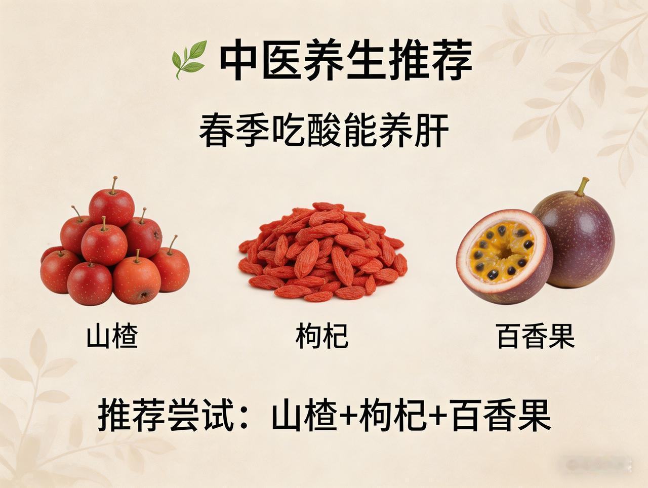 中医推荐:春季吃酸能养肝,试试山楂枸杞百香果 科普专家说慢病·精编 | 春季吃“酸”可疏肝气,试试山楂、枸杞、百香果 当和煦的春风如灵动的精灵,轻柔地拂过大地,世间万物从沉睡中悠悠转醒,焕发出蓬勃的生机与活力,春季,就这样带着满满的希望翩然而至。然而,在中医的智慧体系里,春季与肝脏有着千丝万缕的联系,此时肝气极易陷入郁结不畅的困境。肝,宛如身体这座精密大厦中的“交通枢纽”,主疏泄,承担着调畅全身气机的重要使命。一旦肝气不舒,就如同交通要道发生了严重拥堵,情绪低落、烦躁易怒、胸闷胁痛等一系列健康问题便会接踵而至,严重影响我们生活的品质与内心的安宁。而适当摄入酸味食物,恰似为拥堵的交通开辟出一条条畅通无阻的新通道,能够巧妙地疏肝气、调情志,让身体重归和谐与平衡。下面,就为大家详细介绍几种适合春季食用的酸味养生食材。 山楂:酸甜开胃的“肝脏清道夫” 山楂,宛如大自然馈赠给我们的酸甜宝藏,是春季疏肝气的“明星食材”。它富含多种有机酸,像柠檬酸、苹果酸等,这些有机酸就像是一群勤劳的小刷子,在胃中辛勤工作,促进胃液分泌,增强消化功能。它们能帮助身体快速分解和吸收食物中的营养物质,同时将体内的毒素和垃圾及时清理出去,大大减轻肝脏的代谢负担。新鲜的山楂,口感酸脆爽口,直接咬上一口,酸甜的汁水在口中肆意迸发,让人回味无穷;也能将它精心制成山楂糕、山楂酱,不仅方便保存,还能随时满足我们对美味的渴望。此外,用山楂泡水喝也是一种简单又有效的养生方式。在温热的开水中加入几片山楂,泡出的茶色泽诱人,酸甜可口,还能促进血液循环,让身体在春季焕发出勃勃生机,仿佛给肝脏做了一次全方位的舒适“按摩”。 枸杞:滋补肝肾的“养生瑰宝” 枸杞,虽味道偏甜,但也带着一丝若有若无的酸味,是滋补肝肾的绝佳珍品。它富含枸杞多糖、类胡萝卜素等多种珍贵的营养成分,具有滋补肝肾、益精明目的神奇功效。春季食用枸杞,就像是为肝脏注入了一股源源不断的强大能量,能为肝脏提供充足的养分,增强肝脏的疏泄功能。枸杞可以直接嚼食,每天吃上一小把,简单又便捷,能最大程度地保留其丰富的营养成分,让身体充分吸收;也能用来煲汤、煮粥,比如在鲜美的鸡汤中加入适量的枸杞,不仅能让汤的味道更加醇厚鲜美,还能增加汤的营养价值,为身体提供全面而均衡的滋养,让肝脏在春季得到悉心的呵护。 百香果:酸香四溢的“水果营养库” 百香果,酸香浓郁,宛如一座装满营养的宝藏库,富含维生素C、维生素E、超氧化物歧化酶等多种对人体有益的营养成分,具有极高的营养价值。春季食用百香果,能促进身体的新陈代谢,增强免疫力,帮助肝脏更好地抵御外界病菌的侵袭,就像是为肝脏穿上了一层坚固无比的“铠甲”。可以将百香果切开,用勺子轻轻挖出那饱满多汁的果肉,直接放入口中,感受那浓郁的果香在口中瞬间散开,仿佛置身于热带果园之中;也能将它与香甜的蜂蜜、温热的开水混合在一起,制成一杯酸甜可口的百香果蜂蜜水,既能润肺止咳,又能美容养颜,让身体在春季由内而外散发出健康的光彩。 春季吃“酸”疏肝气,不妨试试这几种食材,让肝脏在春季也能“轻松上岗”,保持身体健康,以饱满的精神状态和昂扬的斗志迎接新一年的挑战与机遇。
