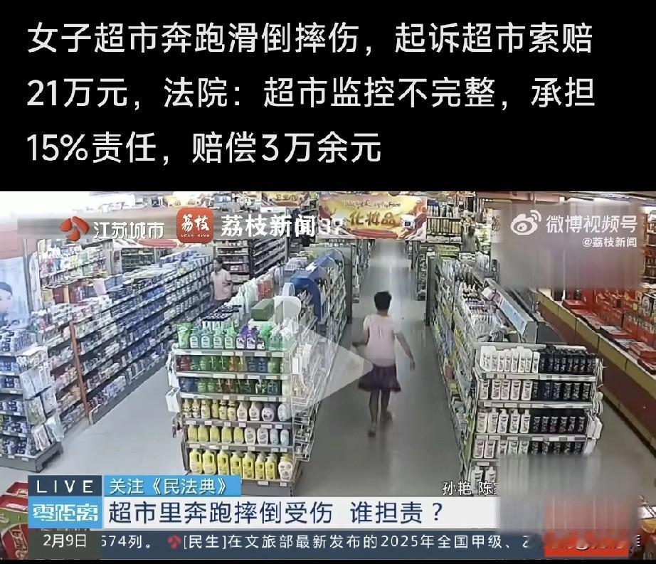 “稀里糊涂的!”女子逛超市时把手机忘在了一个货架上,发现后急忙跑回去拿,不小心滑倒摔成了骨折,随后她把超市告上法庭,索赔21万元,理由是超市地面湿滑,并且没有警告标识,而超市方面则称当时地面不湿,并且提供了监控视频。法院审理后认为:女子跑动时没有注意自身安全,承担85%的主要责任,由于超市提供的视频资料不完全,无法证明自己尽到了安全提醒的责任,所以承担15%的责任,需要赔偿女子3万余元。网友都说:女子自己不注意安全实在是怨不得超市,这判的有点稀里糊涂的!