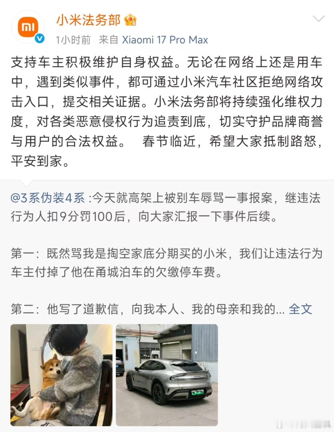想不到吧,小米法务玩真的。小米是真的和车主站在一起维权,这实打实的案例摆在这里了,不仅仅是让对方车主收到了驾照扣分罚款,还有来自肇事者的道歉信。所以别以为互联网上就怎么了,那真能怎么样的,像现在小米法务都已经收到了1.8万多条信息,帮助立案51起。希望这些还躲在互联网上的耗子们谨言慎行,不要去尝试这些。也希望今年互联网舆论会更友好。数码科技评论