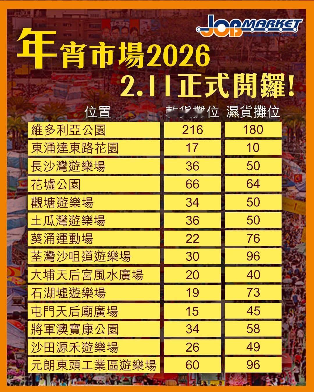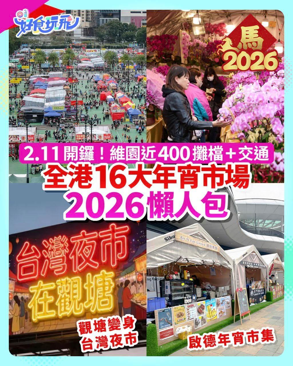 香港各大年宵开锣! 全港各区年宵市场今日(11日)起一连七天举行,共设约1500个湿货、乾货和快餐摊位,方便市民购买贺年植物和花卉、贺年食品、装饰和挥春等,迎接新岁。 高sir一早快闪维多利亚公园年宵市场,行年宵及看看年轻人创意,来一记"马年行运",明天将会去到九龙城。 在全港最大的维多利亚公园年宵市场,设有400个摊位,每年人流也非常多。另外,高sir必须推荐九龙城年宵市场,包括: 1.启德体育园首个户外海滨年宵市集,现场共有30个摊位,集齐年花、手写挥春、新派贺年礼物等,市民更能带同毛孩欣赏绝美海景兼办年货,共度新春佳节。 2.九龙城年宵2026于2月11日起在土瓜湾游乐场盛大举行,为期7天的市集汇聚了82个乾湿货及快餐摊位,是大家办年货和感受节庆气氛的好去处! 食环署表示,14个年宵市场的人流情况将会以红、黄、绿灯形式在食环署网页显示,方便市民知悉现场的挤迫程度。当中绿色代表「人流较少」、黄色代表「场内略为挤迫」、红色代表「场内非常挤迫」。而年宵市场于每日开放时间结束前15分钟停止进场,有意到场的人士需预留充裕时间。 九龙各大年宵市场: (非食环署年宵)九龙区|启德体育园美食海湾 九龙区|旺角界限街花墟公园 九龙区|观塘游乐场 九龙区|土瓜湾游乐场 九龙区|深水埗长沙湾游乐场 今天是南方小年香港各大年宵开锣香港年宵