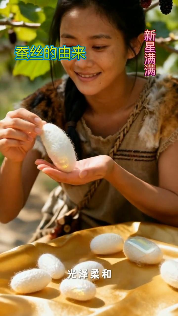 蚕丝的由来。 新星满满。 远古时期,西陵氏之女嫘祖在桑林中发现了改变文明的秘密。她发现桑树上的蚕茧质地坚韧,光泽柔和。一次偶然,蚕茧落入热水竟抽出了细长的丝线。这一发现让她欣喜不已,开始了反复的尝试。她克服重重困难,终于掌握了缫丝纺线的技艺。用蚕丝织成的布料轻盈柔软,光滑细腻。她将这项技艺传授给族人,开启了中华文明的新篇章。 嫘祖被尊为'先蚕娘娘,她的贡献永载史册。养蚕缫丝技术的发明推动了中华文明从蛮荒走向文明。