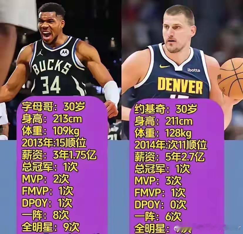 两人都以老大的身份带队夺冠,个人数据也是顶级,而且都是国际球员,字母哥投篮差,防守强,约老师的组织出色,防守略差;