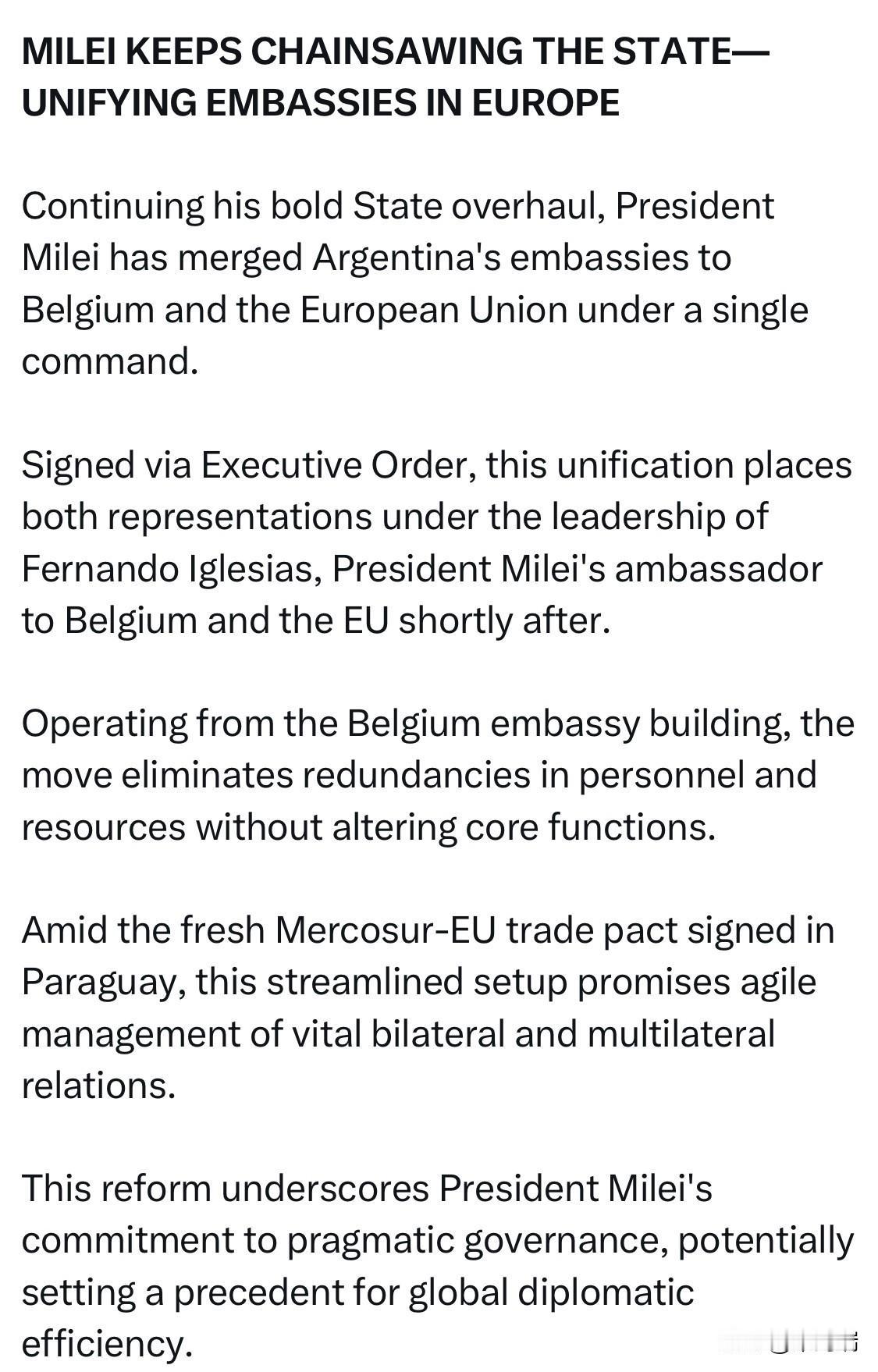 阿根廷总统米莱继续对国家进行电锯式改革——统一欧洲各国大使馆 米莱总统继续推进其大胆的国家改革,将阿根廷驻比利时和欧盟大使馆合并为一个统一指挥部。 通过行政命令签署的这项合并,使这两个代表机构都置于费尔南多·伊格莱西亚斯的领导之下,伊格莱西亚斯随后不久被任命为米莱总统驻比利时和欧盟大使。 此次搬迁至比利时大使馆大楼内办公,消除了人员和资源的冗余,同时又不改变核心职能。 在巴拉圭签署的南方共同市场-欧盟新贸易协定框架下,这一精简的安排有望灵活管理重要的双边和多边关系。 这项改革凸显了米莱总统对务实治理的承诺,有可能为全球外交效率树立先例。